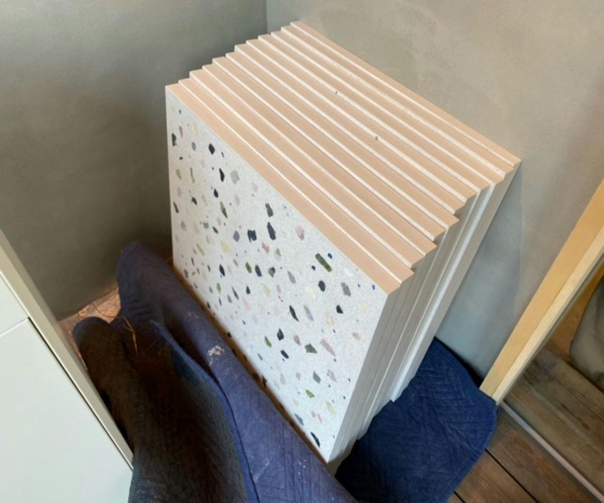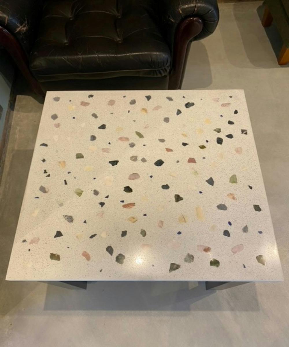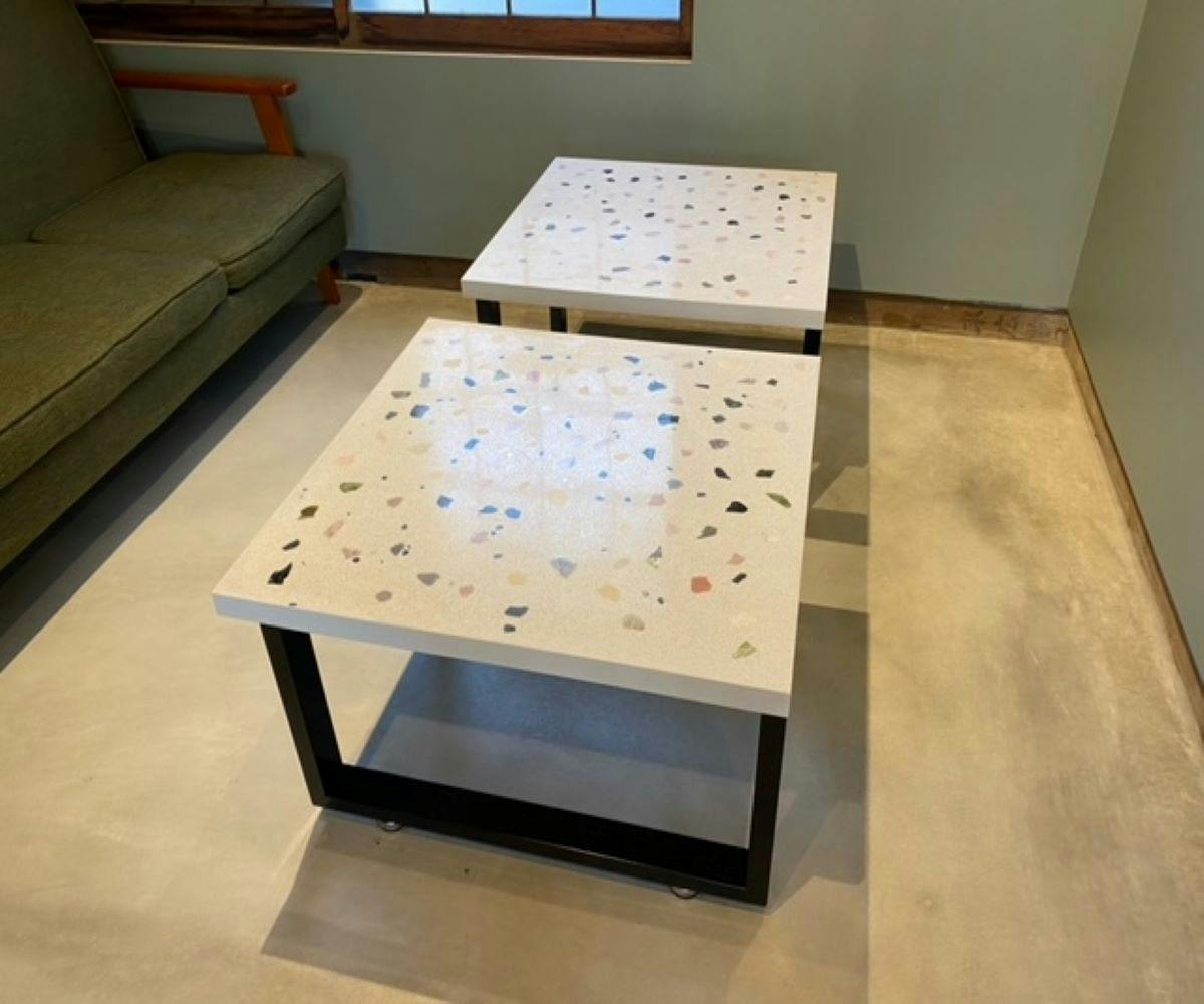 東京都の有限会社茂木左官リファイン様よりビールストンの施工写真をいただきました!カフェに採用いただいたとのことで、天板をたくさん作ってくださいました。大きな種石が良いアクセントになっていてとても可愛いですね。
