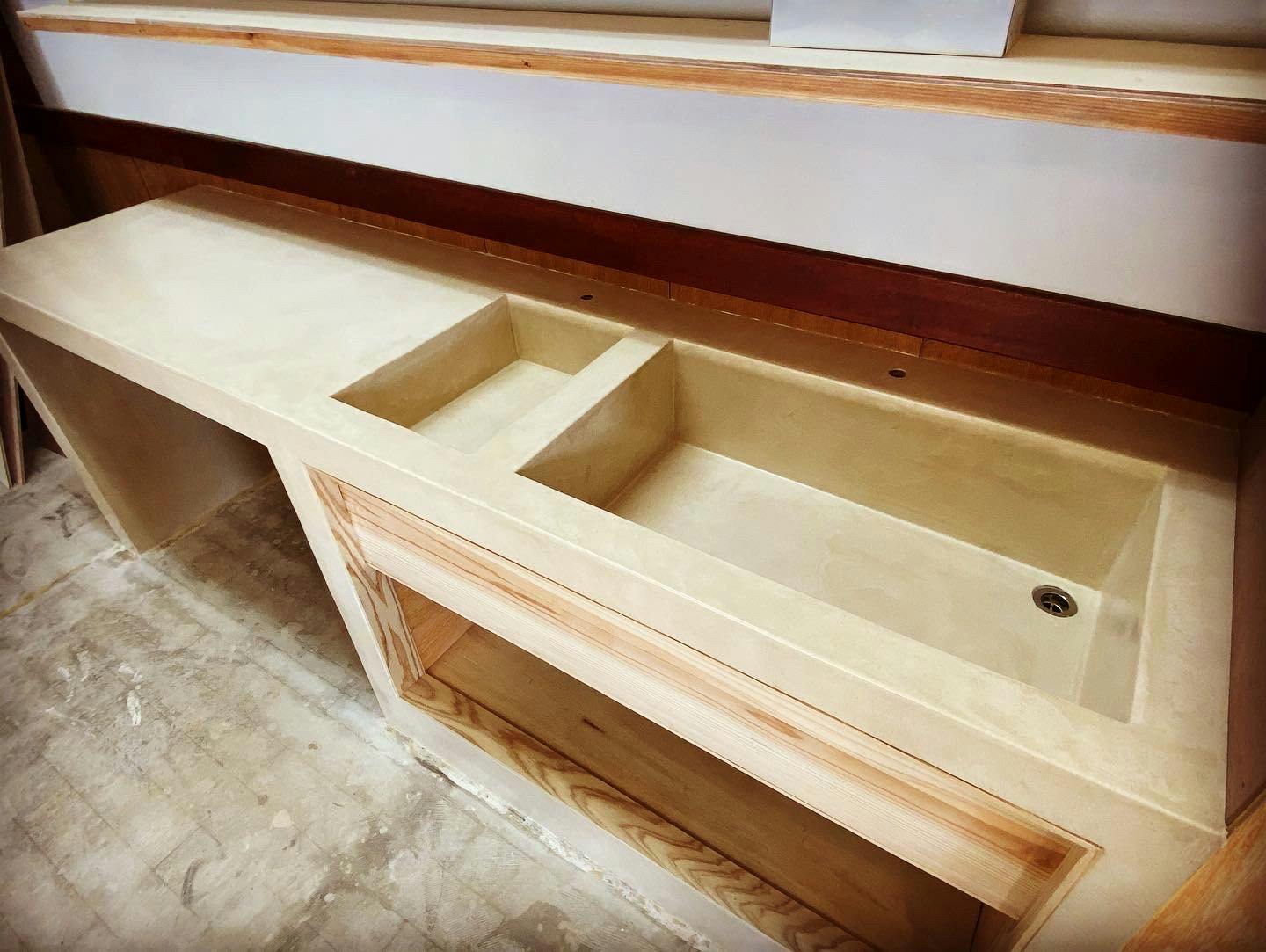 沖縄県のendou左官工房様より施工写真をいただきました!花屋さんのカウンターと流し台をBM31で仕上げられています。やはりベージュ系は温かみをうまく演出してくれますね。そして保護材はビピュールグロスを使用されています!光沢のある仕上がりで、ツヤ感がいい味を出しています。