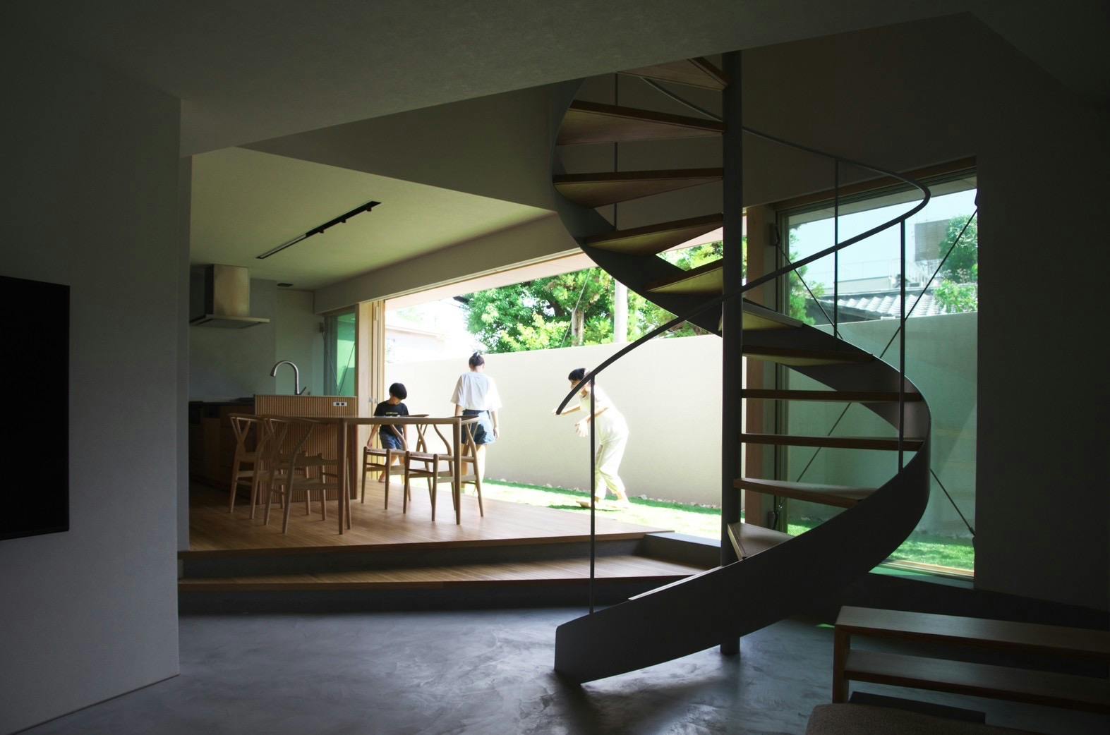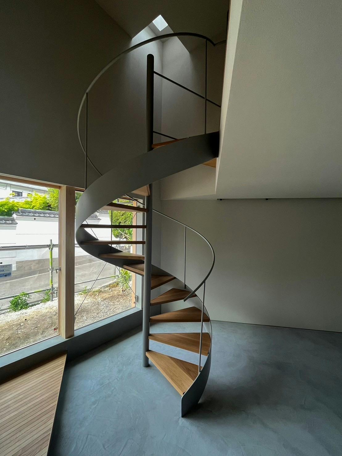 直線の中にある螺旋階段の曲線が、美しく引き立ちます。