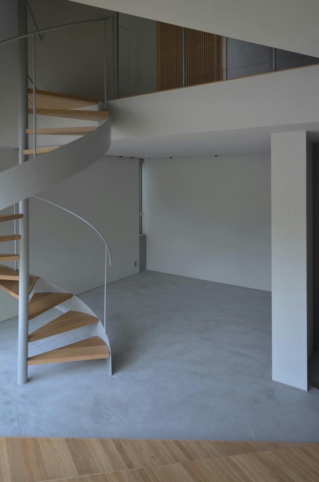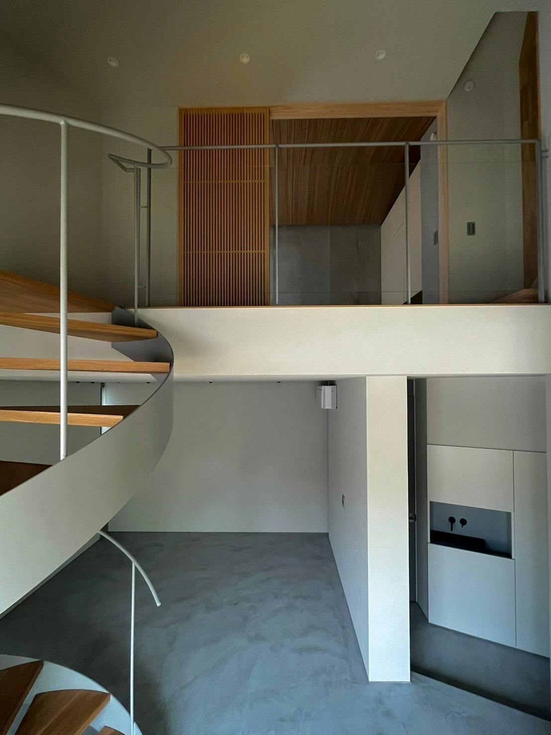 大きな窓から差し込む光、手前には存在感のある螺旋階段、ステップフロアになっている床はモールテックスとフローリングの2種使い。