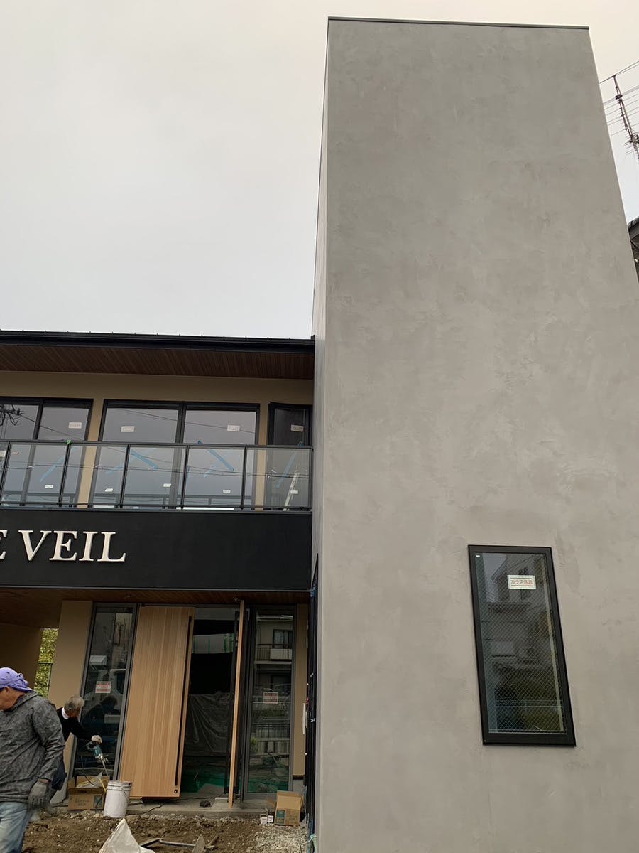 軒天の羽目板やテラスのアイアンとガラスなど、様々な素材が使われている外観でも、モールテックスがよく馴染み、さらにまとまりのある外観になっています。モールテックス独特の表情も垣間見れ、素敵な建物が完成しました。