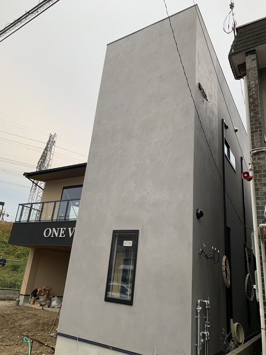 建物の一部、70㎡の外壁を、人気のモルタル色BM68で施工いただきました。