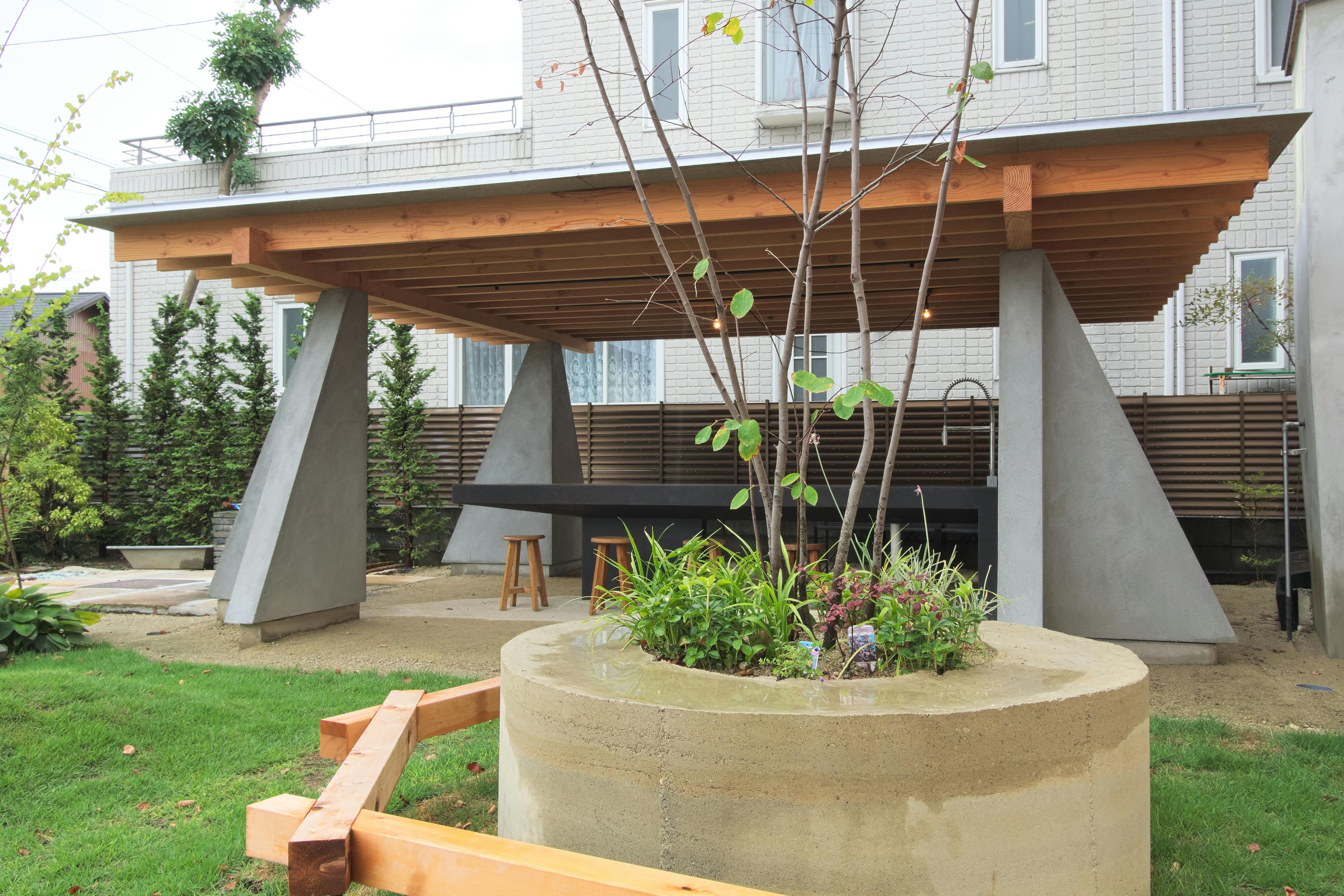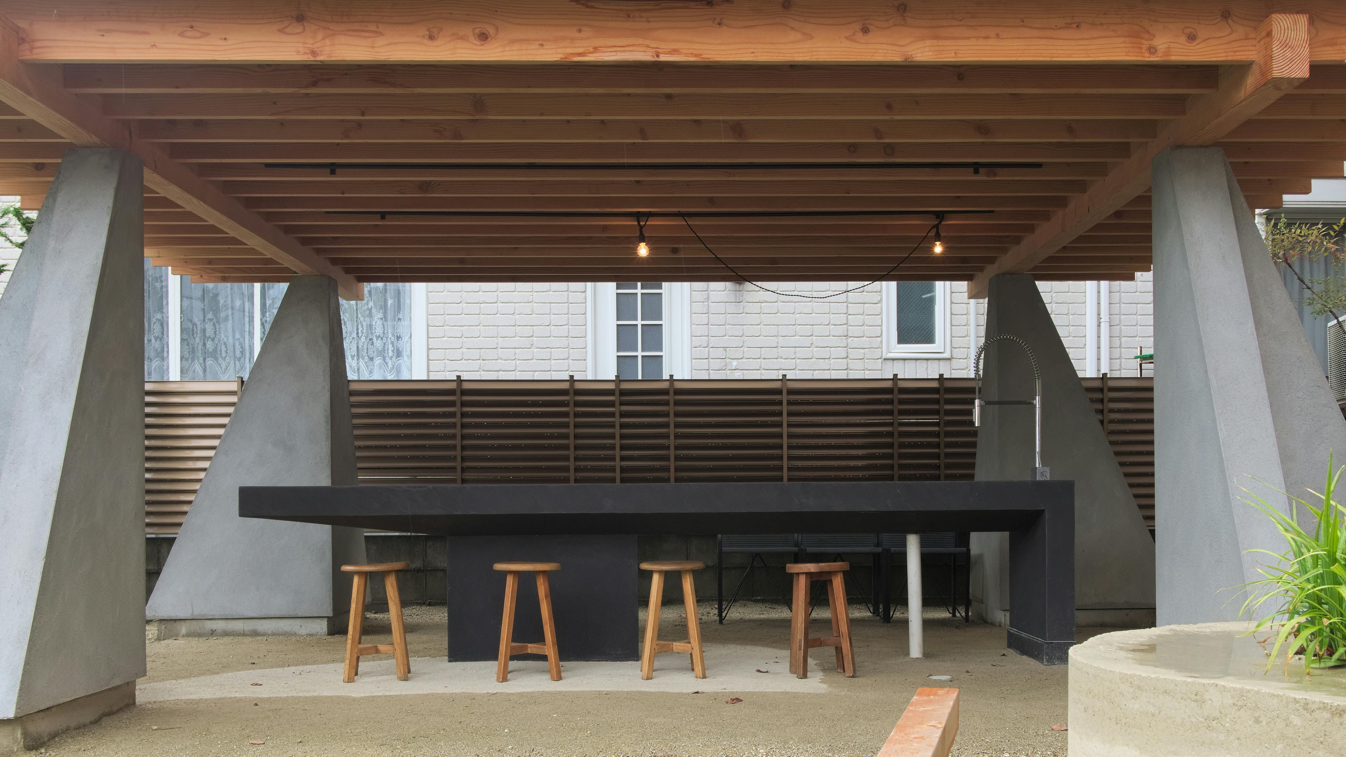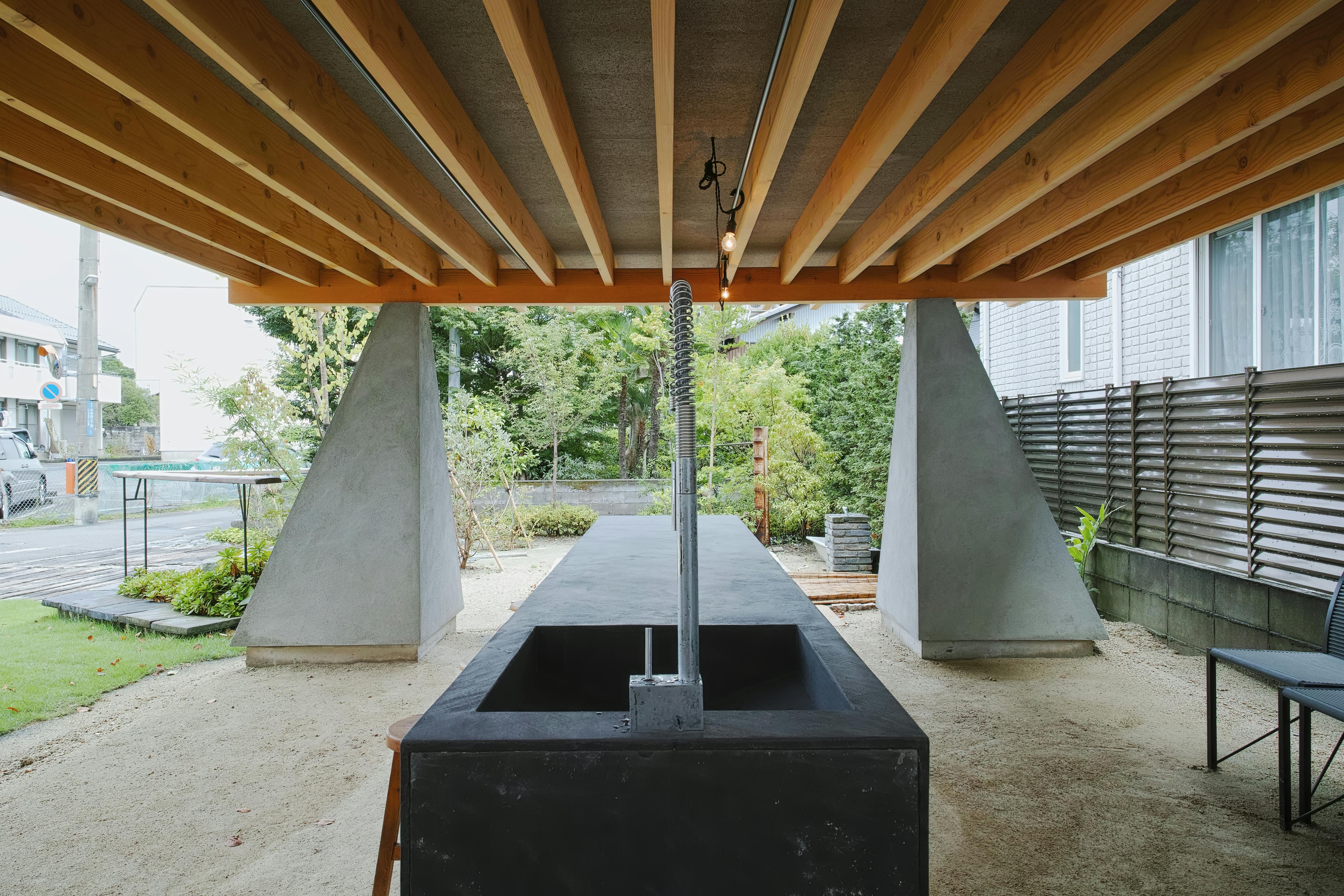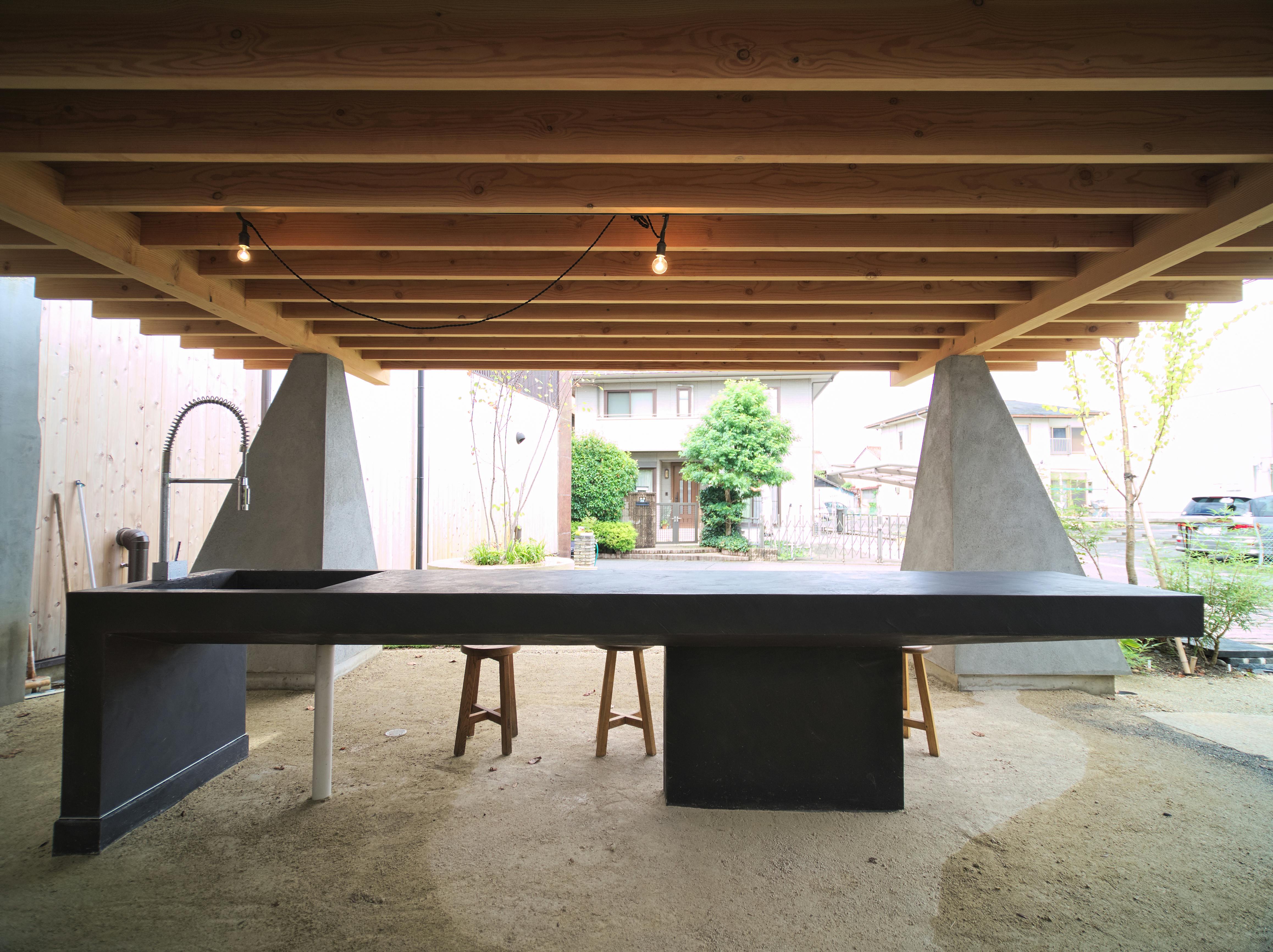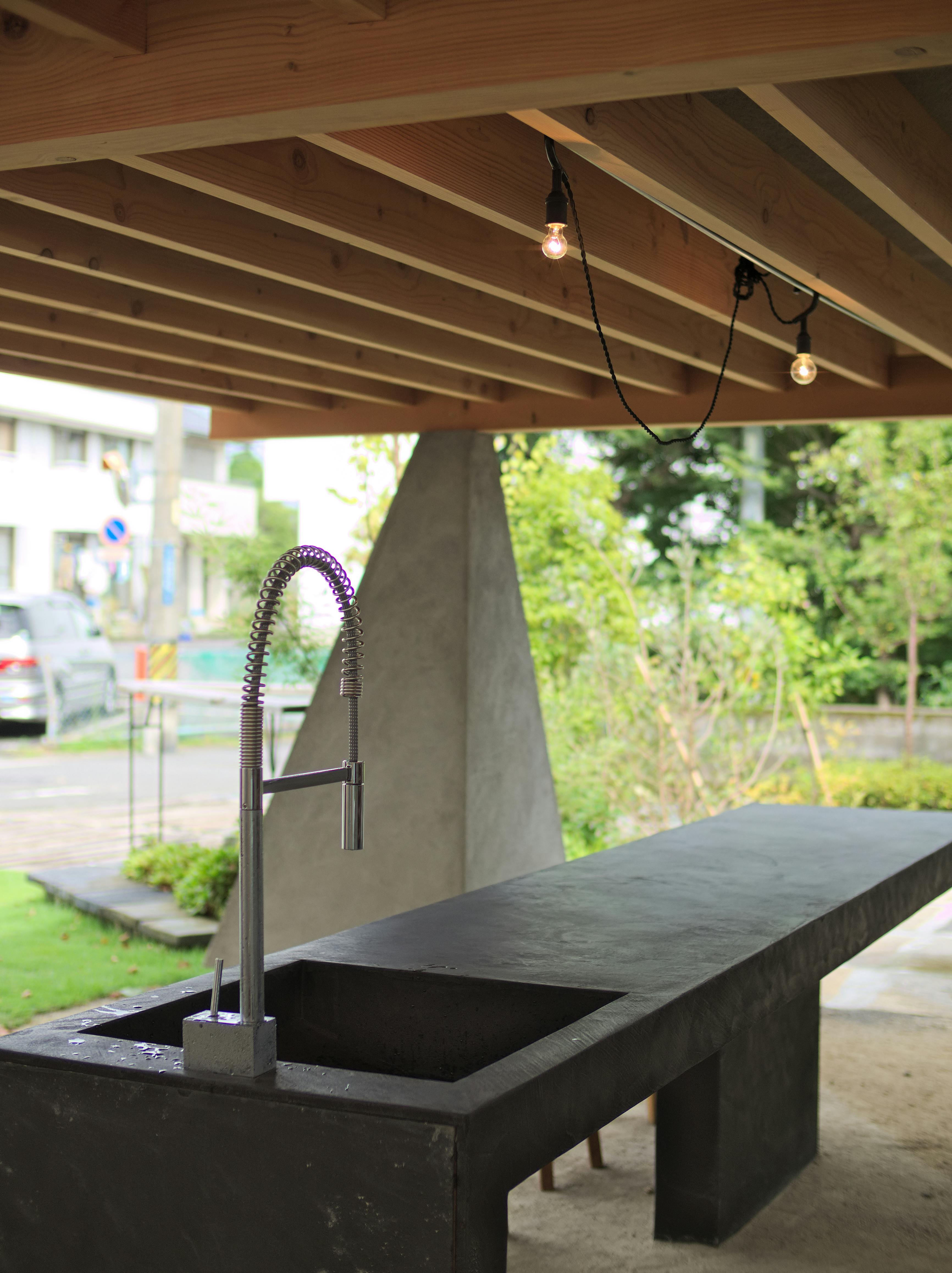 デザイン性の高いコンクリートの柱に、木材を使った屋根天井、そしてその中心にあるのが、モールテックスで仕上げた調理台兼、カウンターテーブルです。水道洗い場も完備して、その場で調理したお食事を楽しめます。