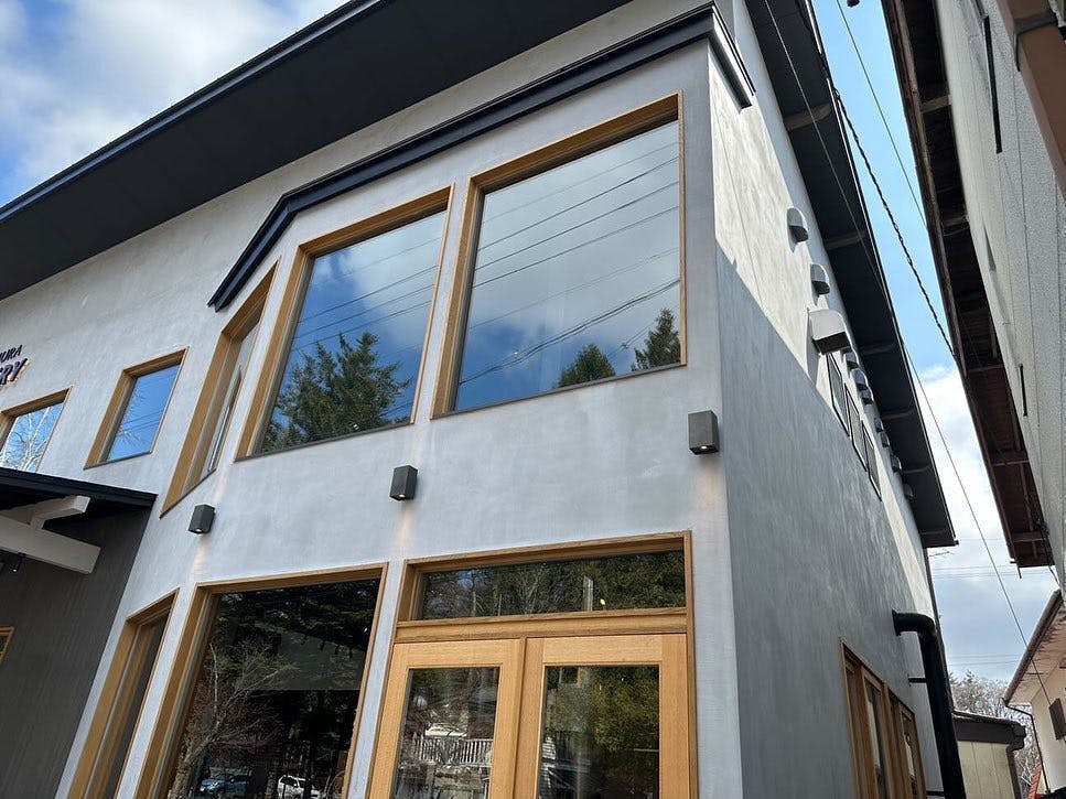 自然のグリーンや木材のブラウン、柱のグレーの中、ブラックのモールテックスが空間を引き締め、まとまりのあるコントラストになっています。夜には天井のペンダントライトがまた違った雰囲気を演出してくれることでしょう。