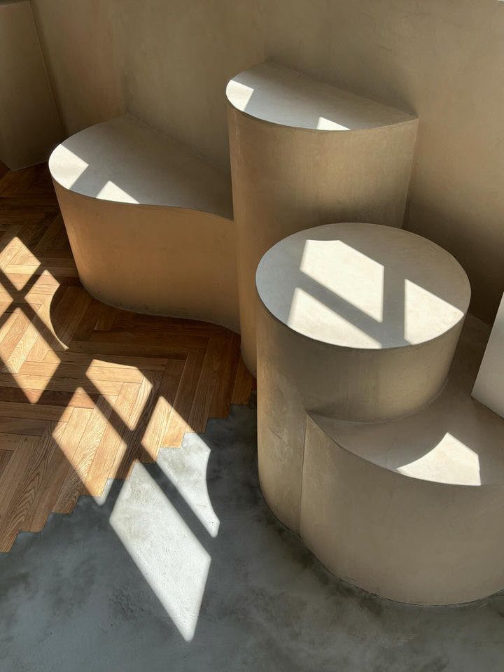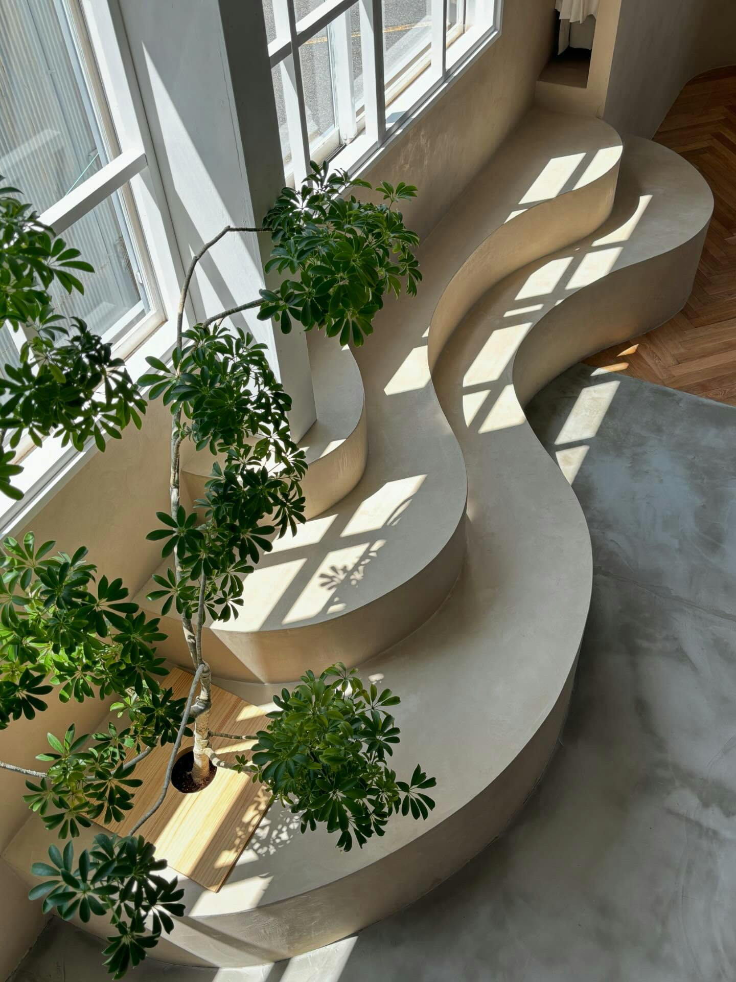 高さや形が異なる造形もシームレスにすることで、一体感が生まれ、曲線が滑らかに美しく再現されています。モールテックスの質感も相まって、思わず触れたくなるような出来栄えになりました。壁と繋がっていることで、腰掛けや、インテリアを飾る台としても利用可能。ヘリンボーンの床と、モルタルの床の間にあることで、それぞれの素材がお互いを尊重しているようにも伺えます。モールテックスの中でも人気のあるホワイト系の色を選択したことで、より相性良くマッチしています。