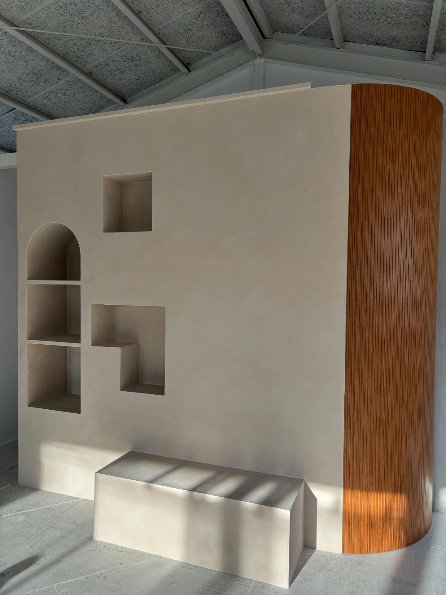空間の一角に設置された装飾棚もモールテックスでシームレスに仕上げています。木目調のアクセントにも合うように、ベージュ系のニュアンスカラーを選択。モールテックスは、メインとなるカラーだけでなく、絶妙な色合いも調整できるため、理想のカラーを追求することができます。