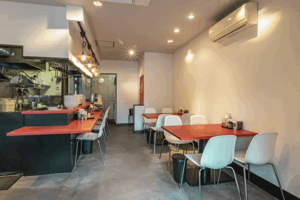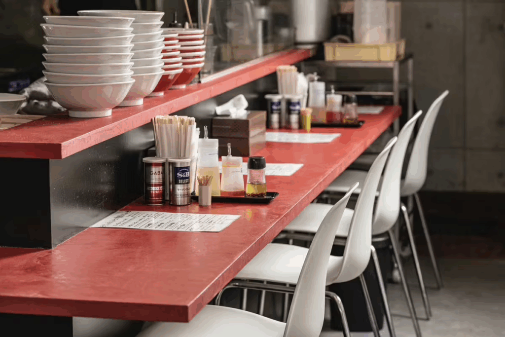 ラーメン屋さんらしい赤のカウンターテーブルが、店舗内を鮮やかに彩ってくれていますね。
