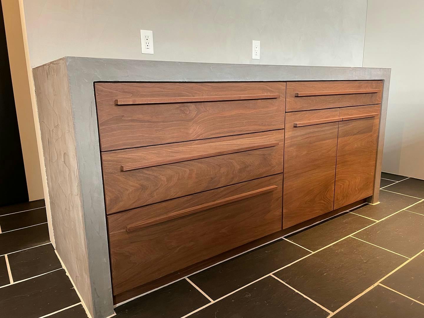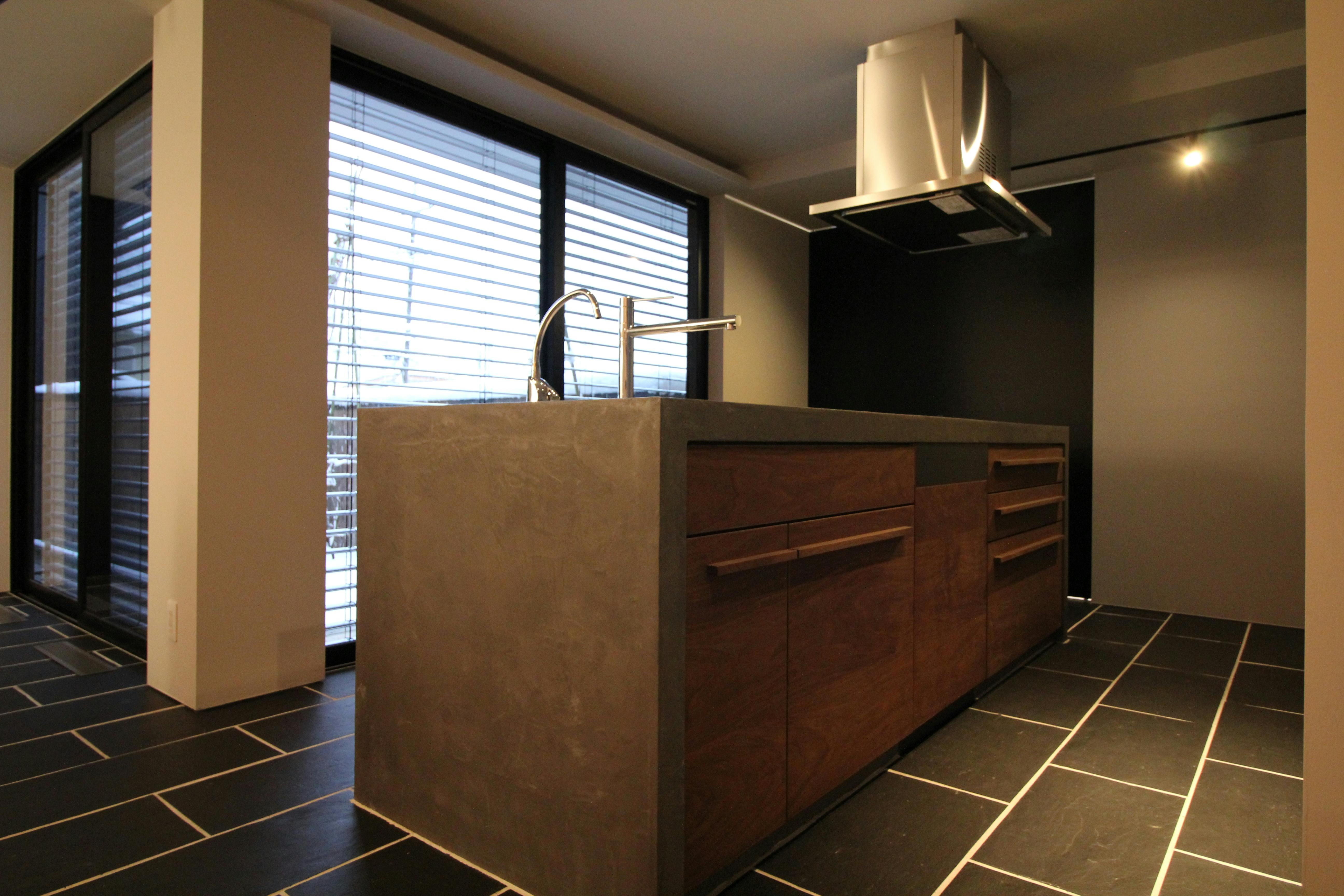 キッチンの天板とフロアキャビネットに使用しており、照明やレイアウトを生かした空間を作り出しています。