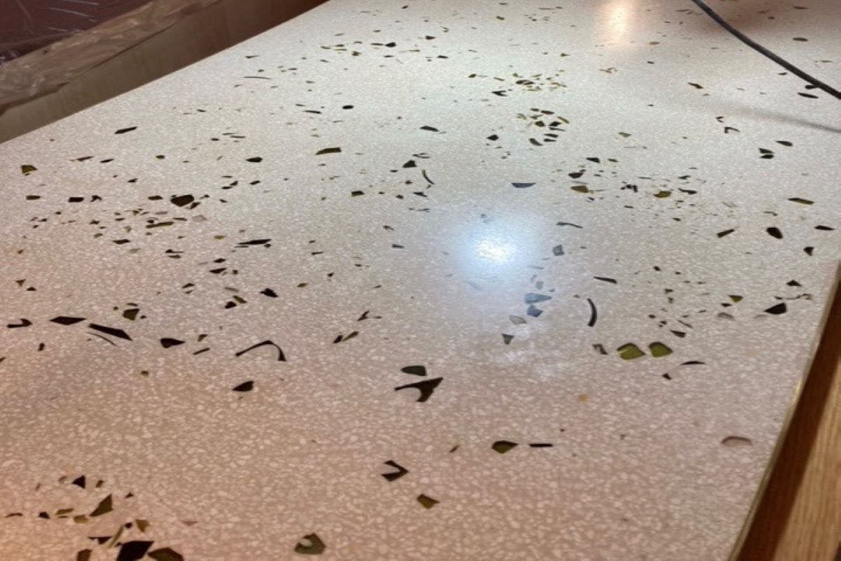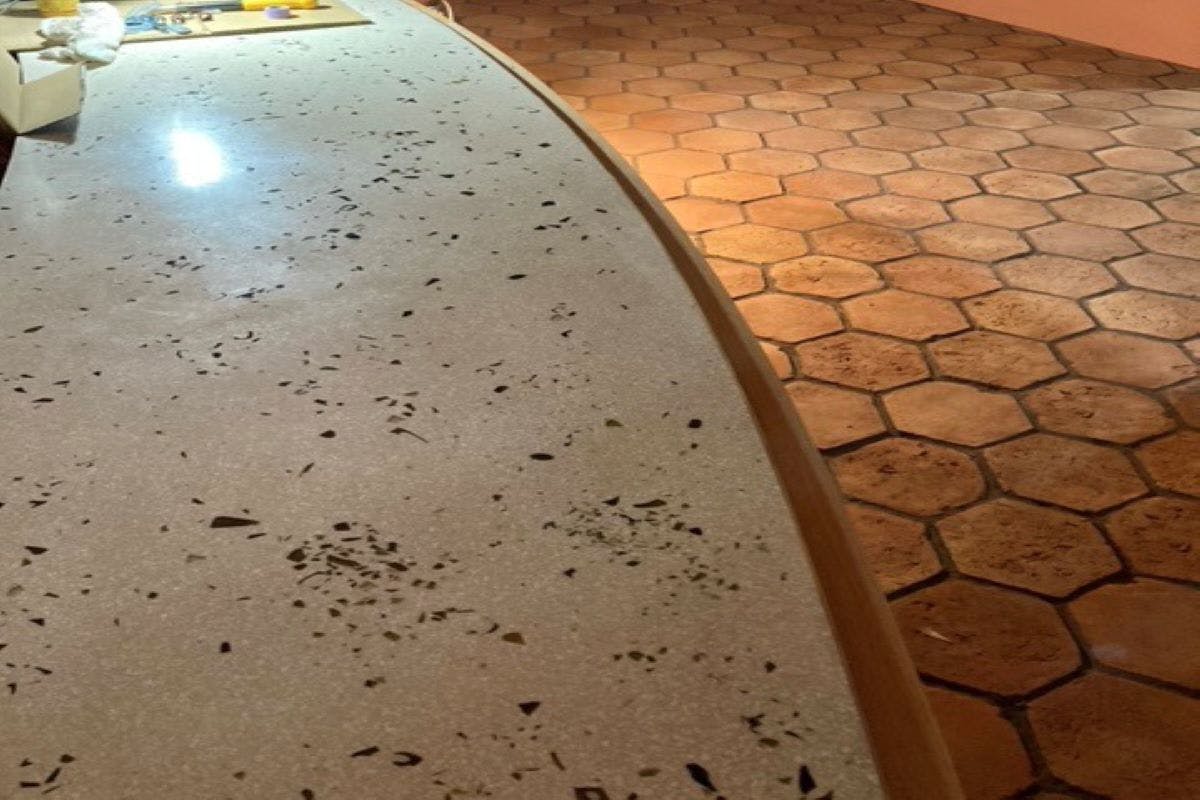 床、天板、什器と多くの場所を大小様々な石で遊び心を加えながら仕上げています。
