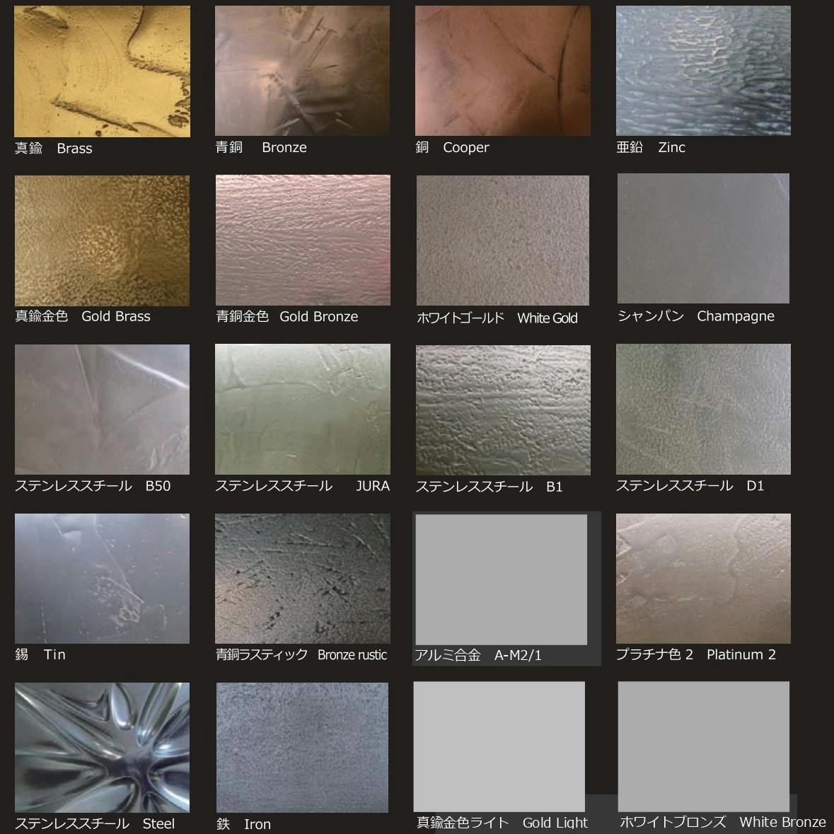 ミダスメタルには20種類の金属色があり、実際の金属とほぼ同等の質感を得ることができます。