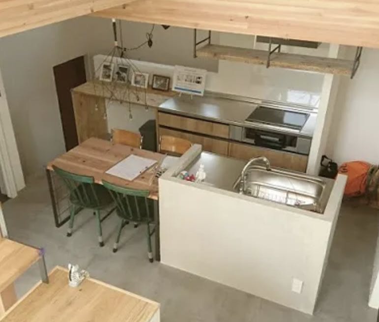 キッチンが壁と接しておらず、完全に独立し、名前の通り「島」のような形のキッチンです。キッチンでの作業も開放的に感じられ、リビングやダイニングにいる人とコミュニケーションがとりやすいと、近年では人気があります。アイランド型キッチンは、遮るものがなくリビングから丸見え状態となるため、常にキッチンをきれいにする必要が出てきます。加えて、油汚れが飛びやすく、油煙やにおいが拡散しやすいといったデメリットの声もあるようです。