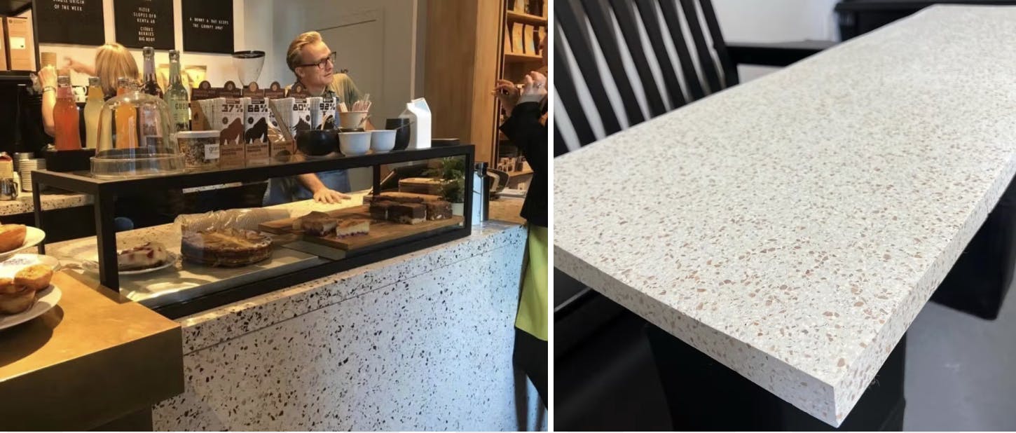 ビールストーンは、大理石の様な質感をしているのが特徴です。表面を研磨することで、光沢を伴った高級感のある仕上がりにできます。ビールストーンは、様々な骨材をモルタルで包んで膜をつくる新しい左官材で、テラゾーや研ぎ出しの雰囲気を薄塗りで仕上げられ、様々な色や天然の石、自然の中で取れた貝殻など、お好きな骨材を入れることができるため、大理石を使えないようなところにも用いることが可能です。ビールストーンが活躍できる場面は非常に広く、店のカウンターや什器の天板、テーブル等といった家具にも取り入れられることも珍しくありません。