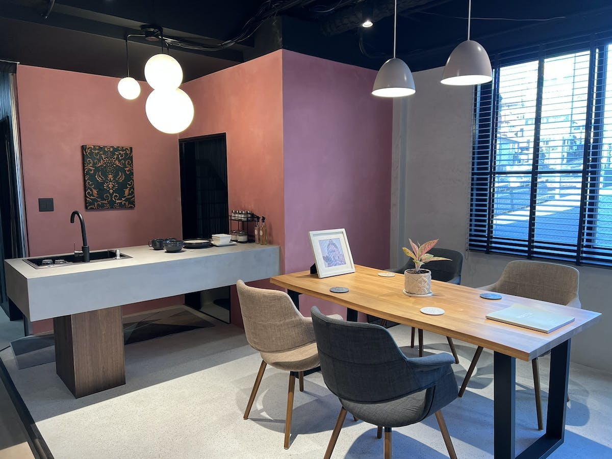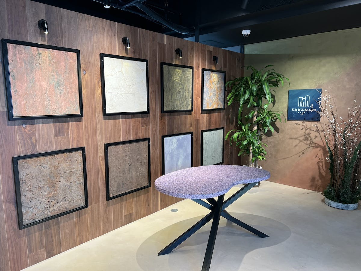 サカンアート正規販売材料であるモールテックスやビールストーン、ミダスメタルなどの質の高い輸入左官材料をふんだんに使用したショールームが愛知県にあります。モールテックスをメインとした様々な仕上げをした箇所を実際に見て、触れていただける空間に仕上がっております!