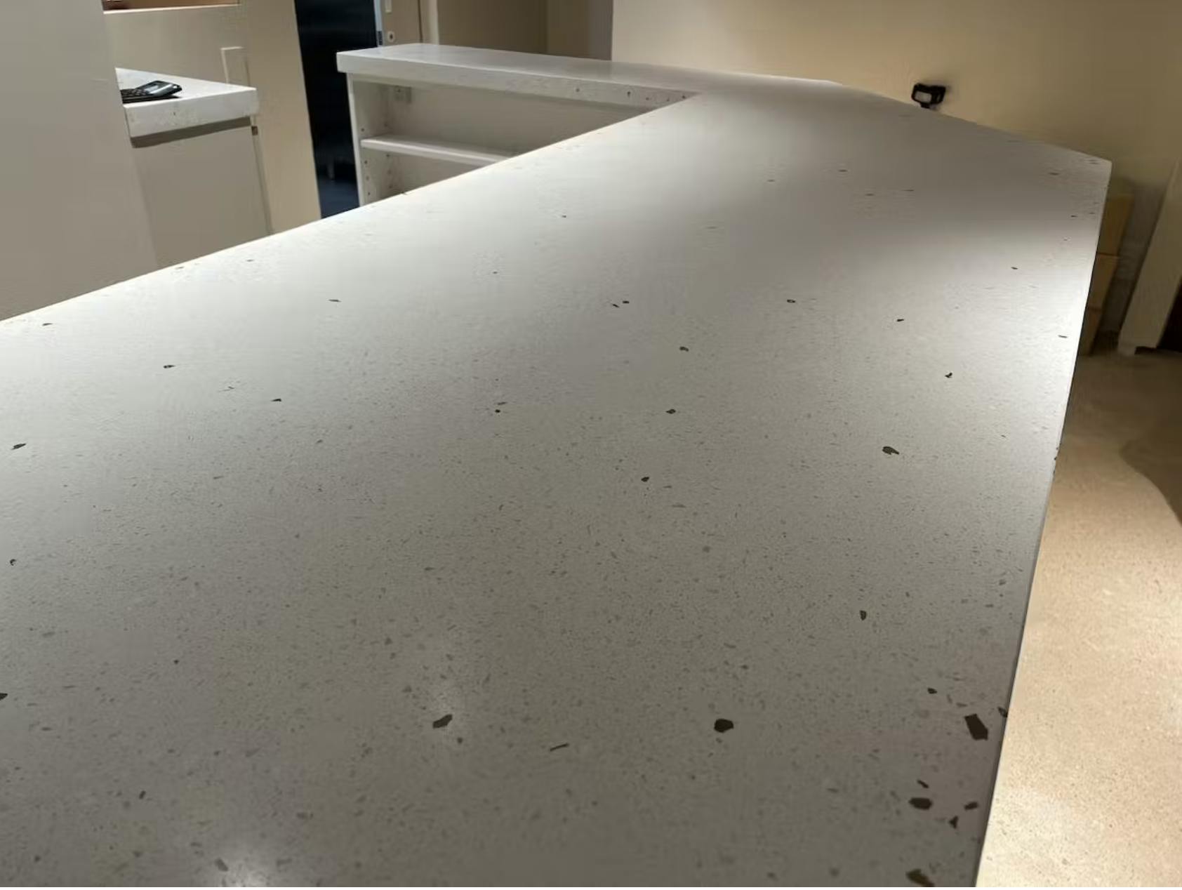 グレー系の下地のカウンターテーブルは、高級感ある仕上がりとなっています。種石は周囲の雰囲気に馴染むものをお選びいただきました。