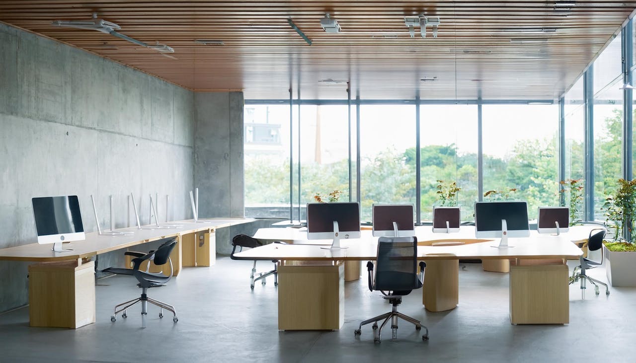 コンクリート打ち放しの建物は、壁や天井にコンクリートが使われているため、柱を必要最小限に抑えることができます。