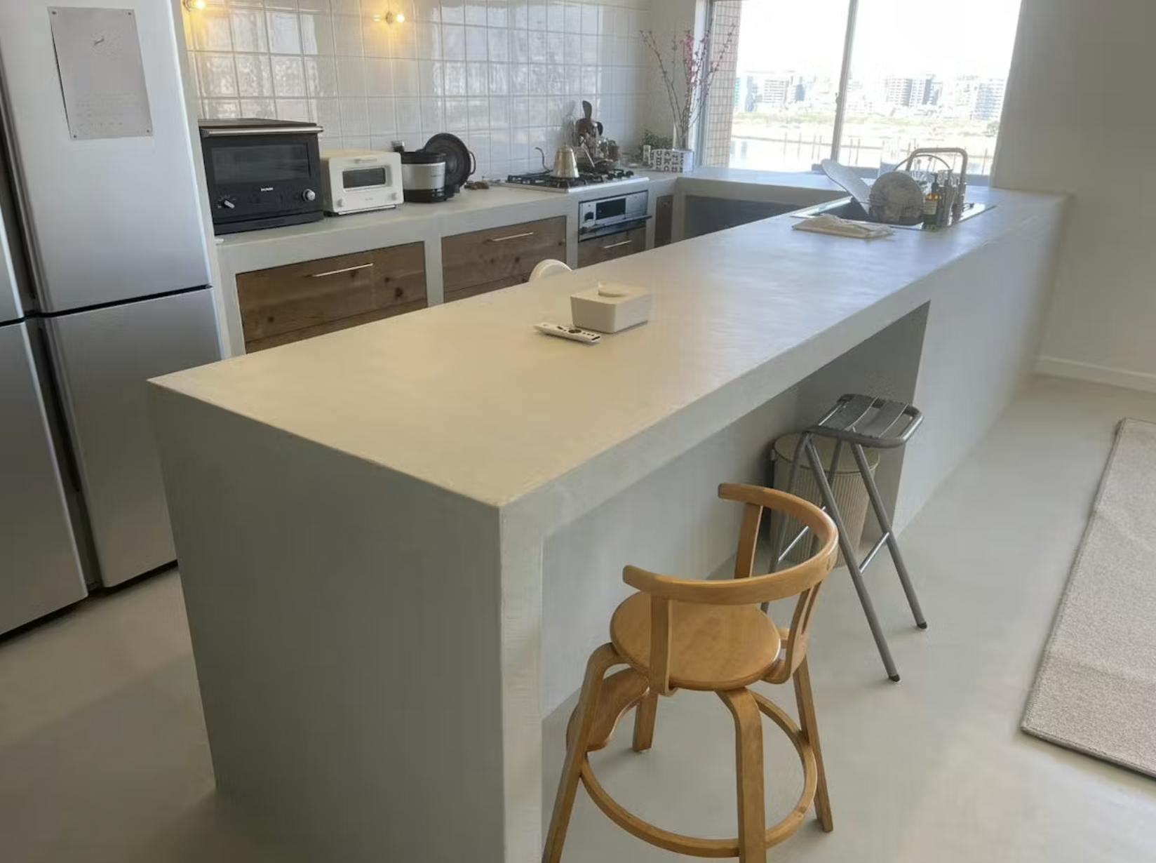 見た目の美しさだけでなく、モールテックスは防水性と耐久性にも優れています。特殊な樹脂が配合されているため、キッチンや洗面所、浴室などの水回りにも安心して使えるのです。さらに、表面圧縮強度はコンクリートの1.5倍と言われており、床やカウンターといった摩擦や衝撃が多い場所でも長く美しい状態を保つことができます。また、定期的なメンテナンスも簡単で、適切なケアを行えばその美しさと機能性をさらに長持ちさせることが可能です。耐久性と柔軟性を兼ね備えているため、ひび割れが起きにくいのも特徴です。