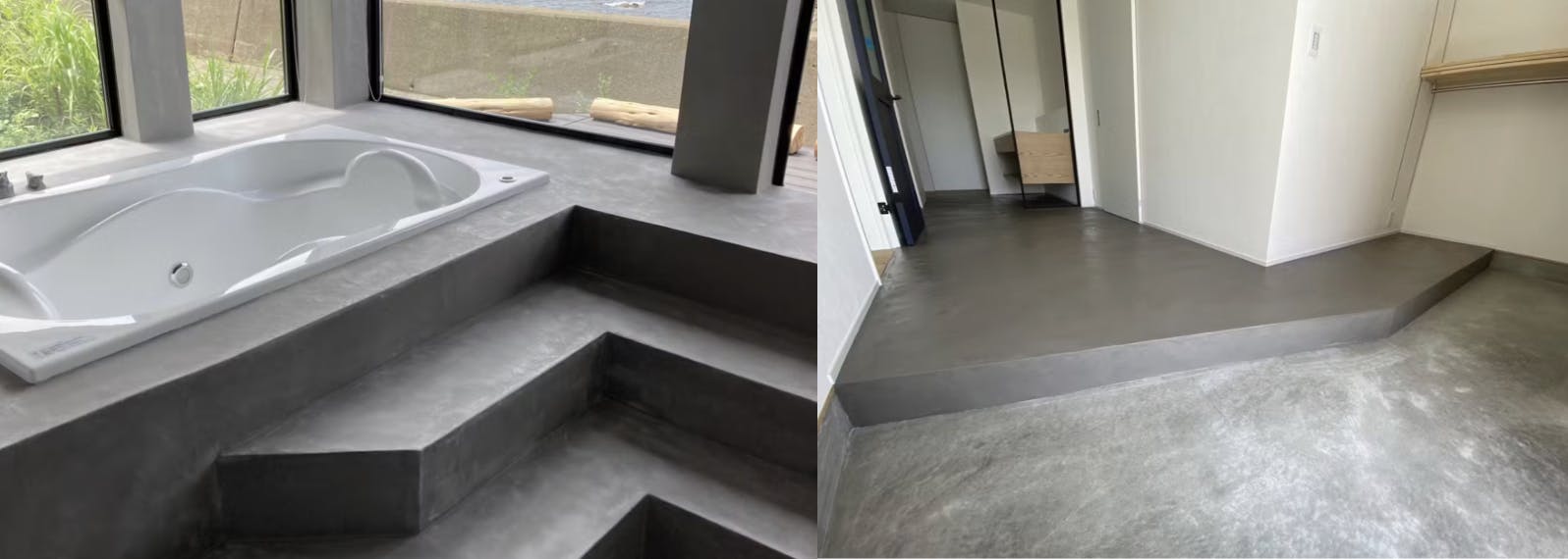 機能面でも優れており、モールテックスは防水性と耐久性を備えています。特に水回りでは、その防水性能が発揮され、キッチンや洗面所、浴室などの湿気が多い場所にも安心して採用できます。さらに、表面圧縮強度はコンクリートの1.5倍と言われており、床やカウンターのような摩耗しやすい箇所でも長期間、美しい状態を保つことができます。