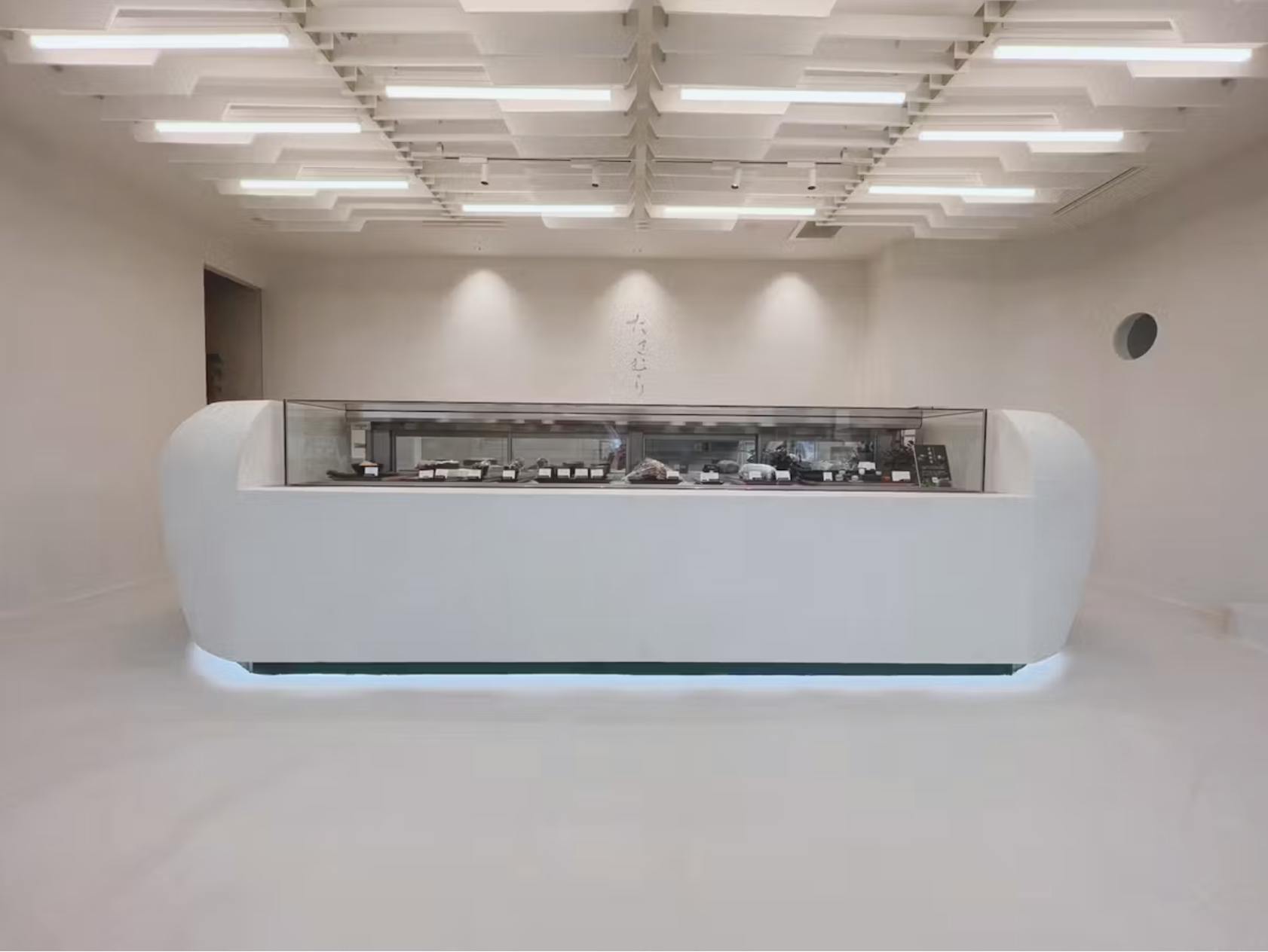 神奈川の施工事例では、壁、床、カウンターをすべてモールテックスで統一し、神秘的で明るい空間を実現しました。使用されたのは最も白みの強いBM04というカラーで、清潔感と高級感が漂う仕上がりです。カウンター部分はシンプルながらも曲線美が生かされ、空間に立体感と柔らかさを加えています。また、統一された白い空間はディスプレイされる商品や家具の存在感を際立たせ、シンプルながらも洗練された印象に仕上がっています。モールテックスの美しさと機能性が融合した、素晴らしい施工事例です。