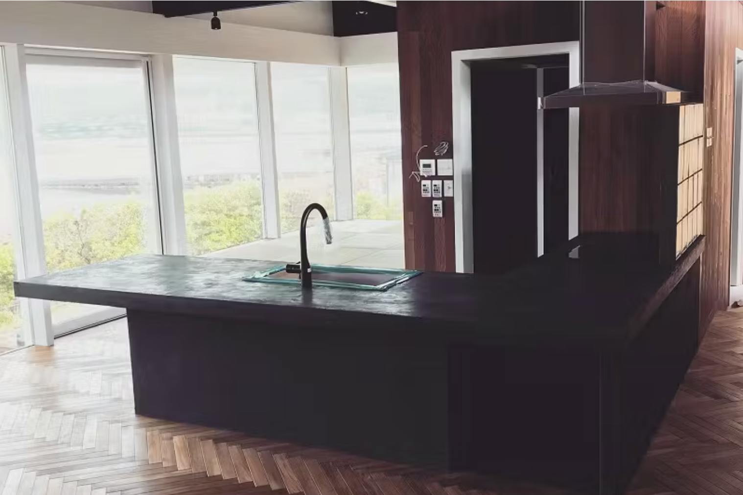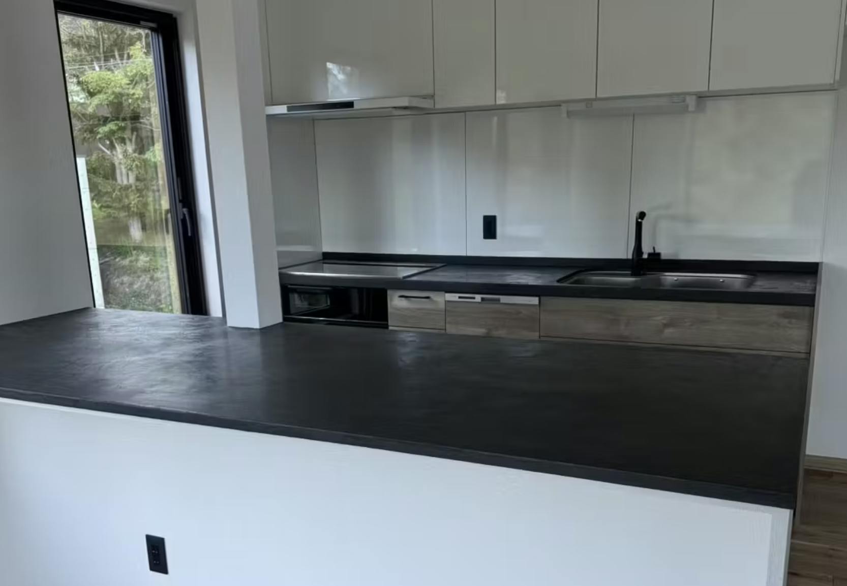 特に、ブラックの天板を使うことで、自然素材と調和しつつ、空間を引き締める効果があります。