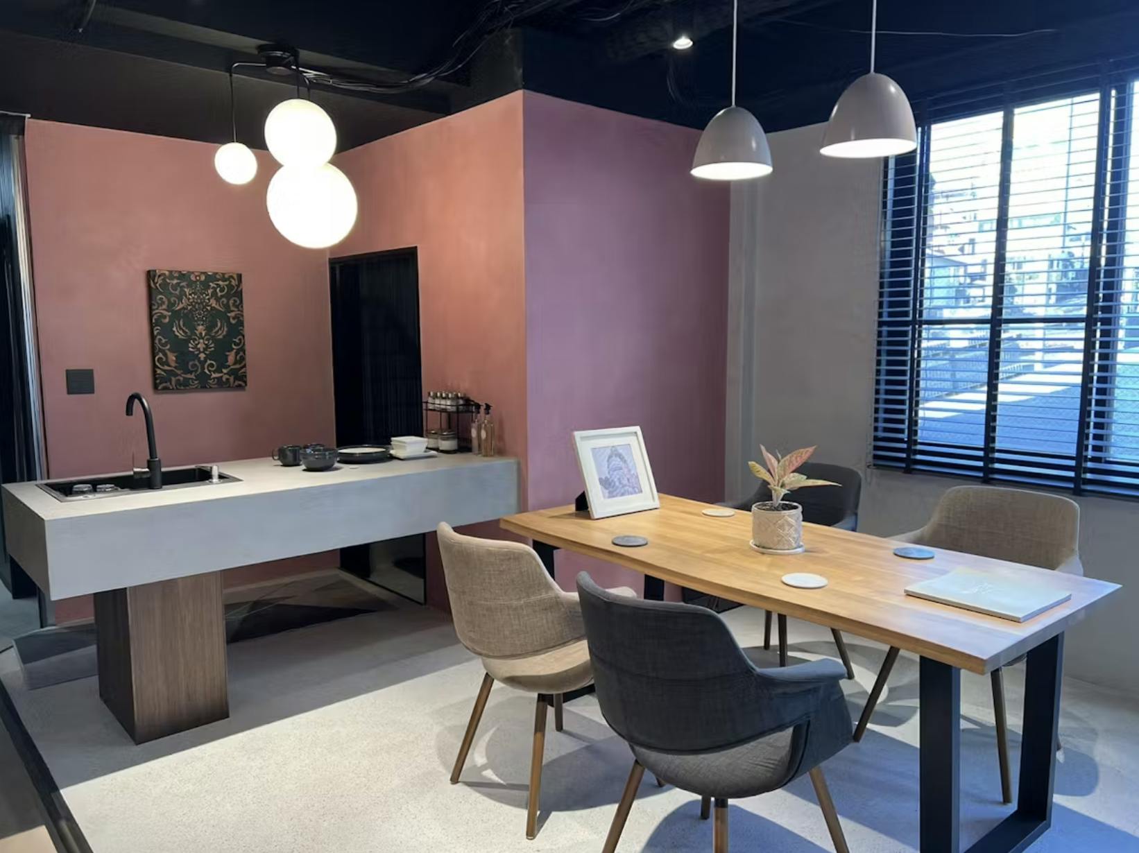 • ブラックのモールテックスを採用 → コンクリート柱や木材の天井と相性抜群