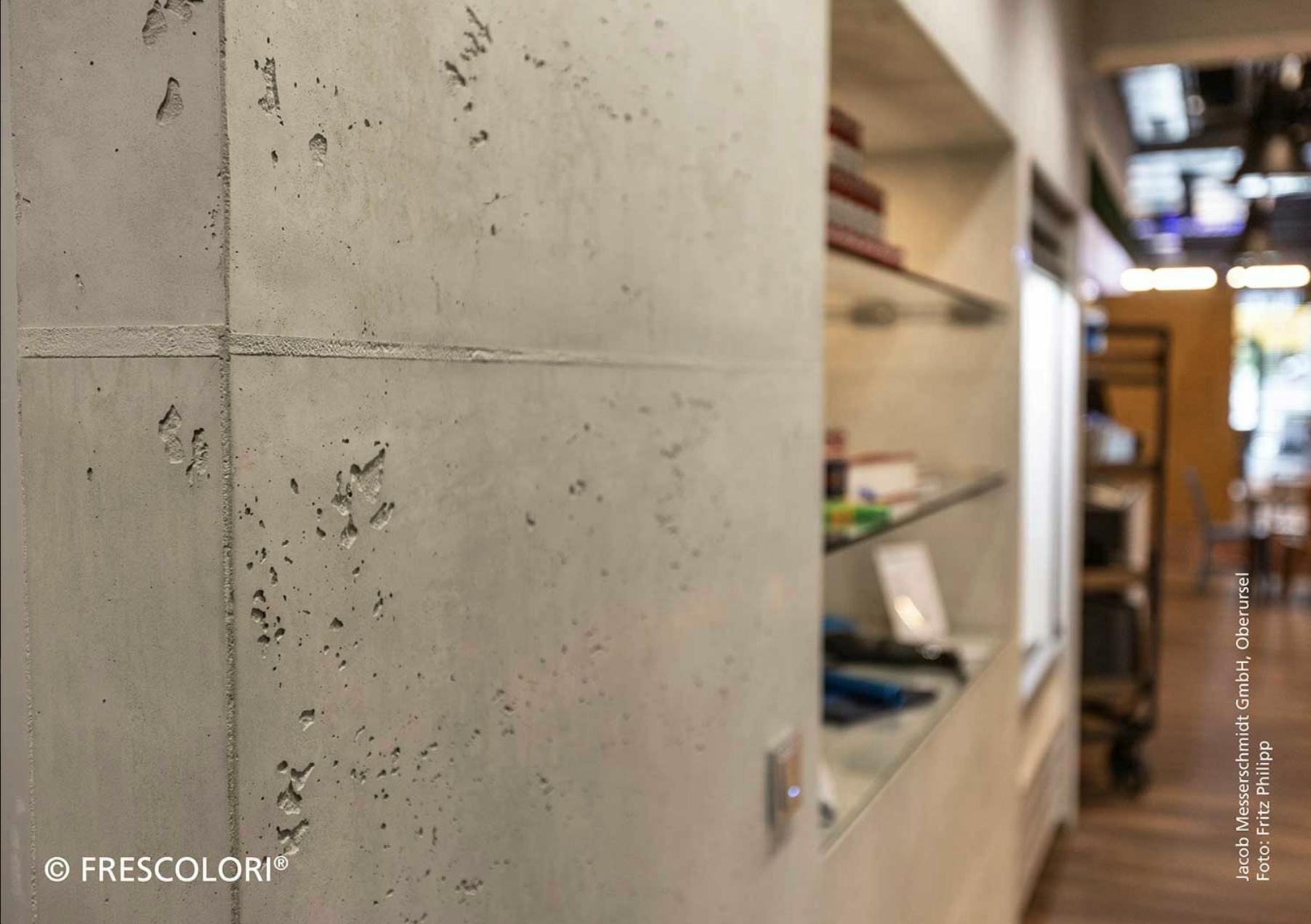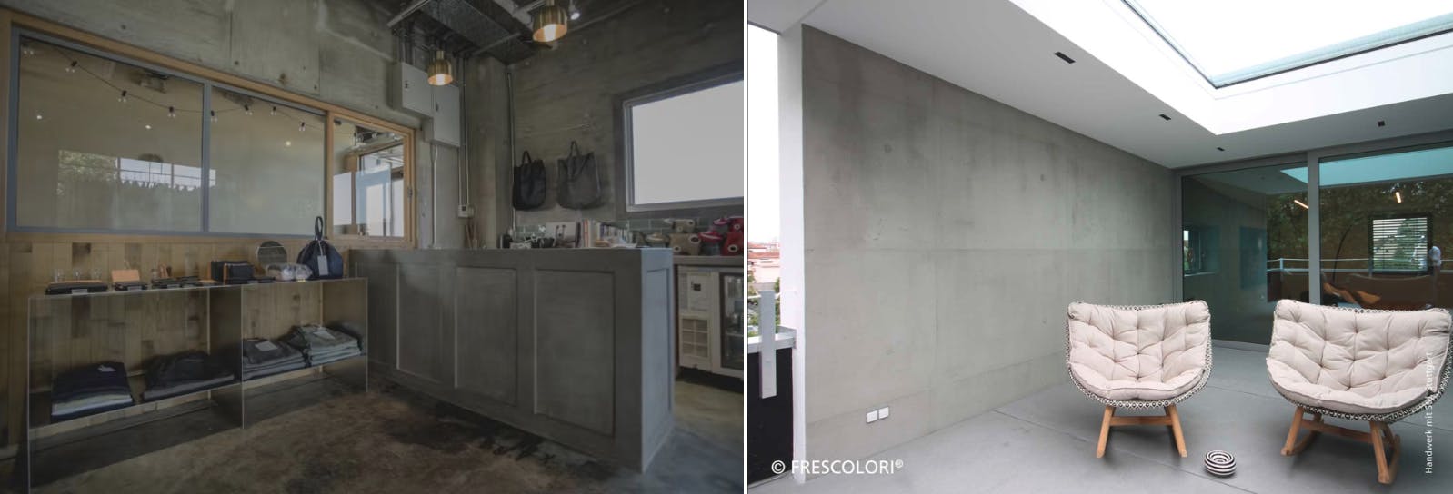 そこで注目されているのが、左官材「フレスカラリ」です。ドイツ生まれのこの素材は、リアルな打ちっぱなしの質感を壁に再現できるため、既存の店舗でも構造などの大幅な工事なしで導入できるのが魅力です。コンクリート風の質感に加え、カラーバリエーションや表情の自由度も高く、オリジナリティある空間づくりが可能なため、どんな場所でも使いやすいというメリットがあります。