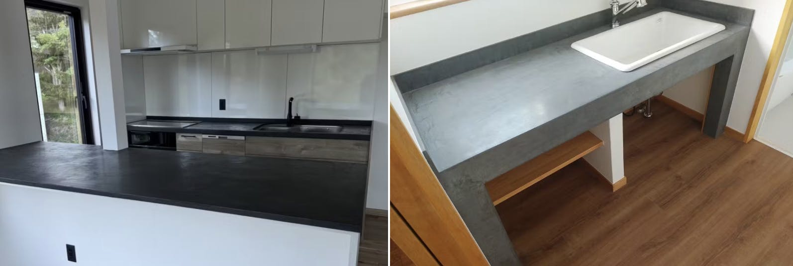 モールテックスは“左官なのに防水できる”という高機能素材で、キッチンや洗面台、テーブル天板など、摩耗や水に強い場所に最適です。表面はなめらかで均一な質感が特徴で、シームレスな仕上がりが魅力です。