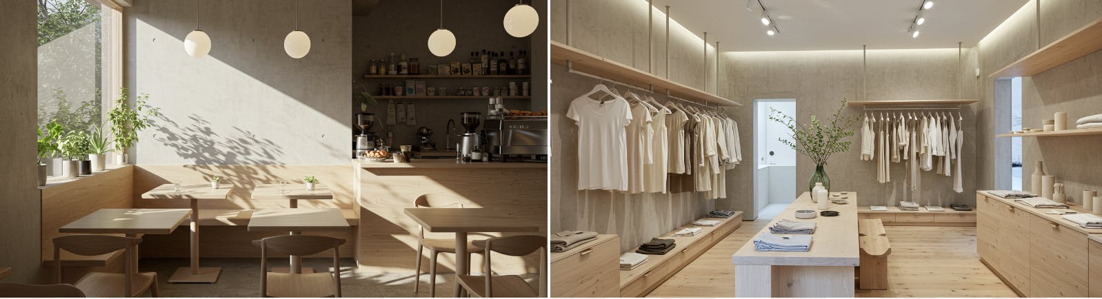 【店舗】では、商品よりも主張しすぎない素材として重宝されます。カフェなどの店舗では「背景としての質感」が空間全体の統一感を生み出し、ブランドイメージを高める効果も。