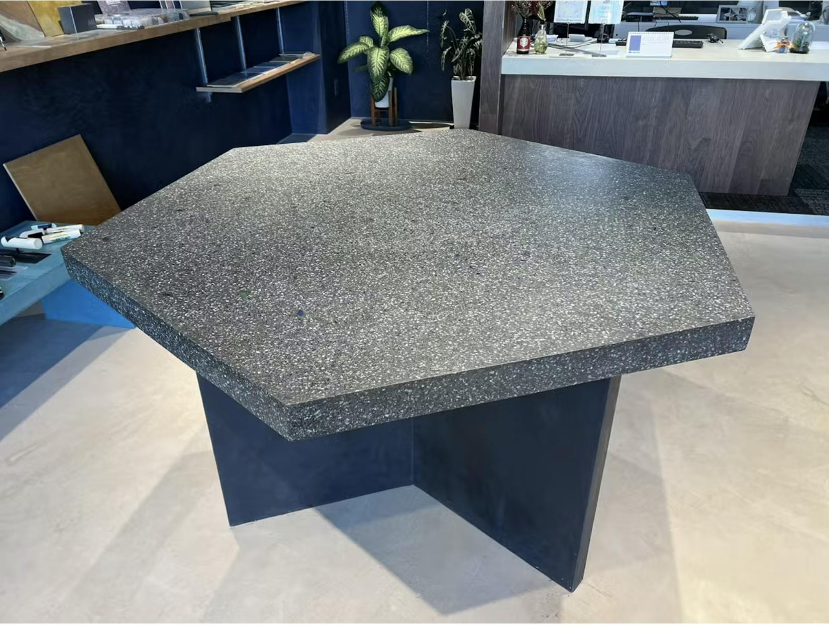 ビールストーンは、壁や床だけでなく、家具や什器にも施工できる柔軟性が大きな魅力です。サカンアートの施工事例では、サイドテーブルや店舗のカウンターテーブルなど、視線を集めるインテリアの主役として活用されています。