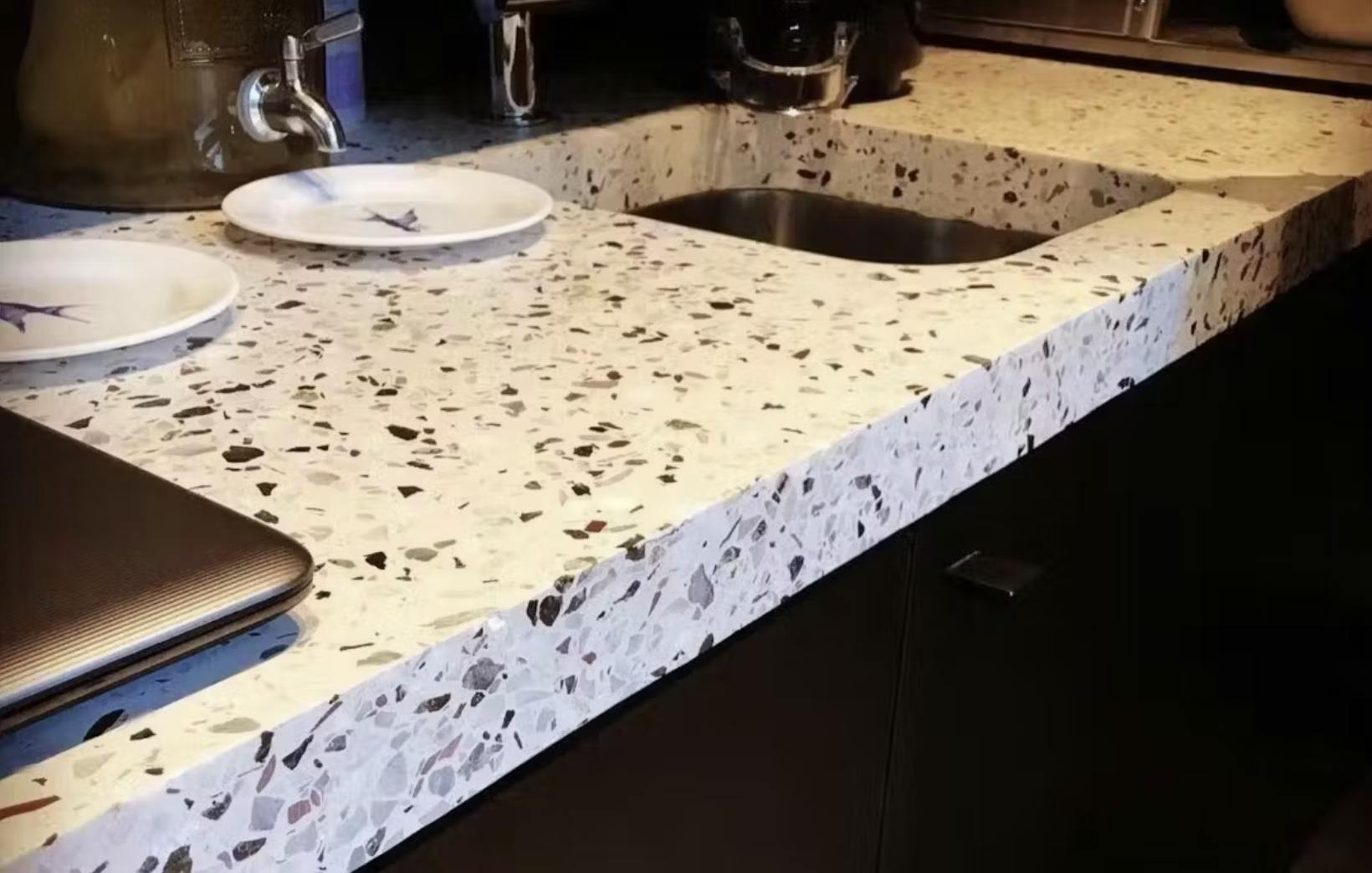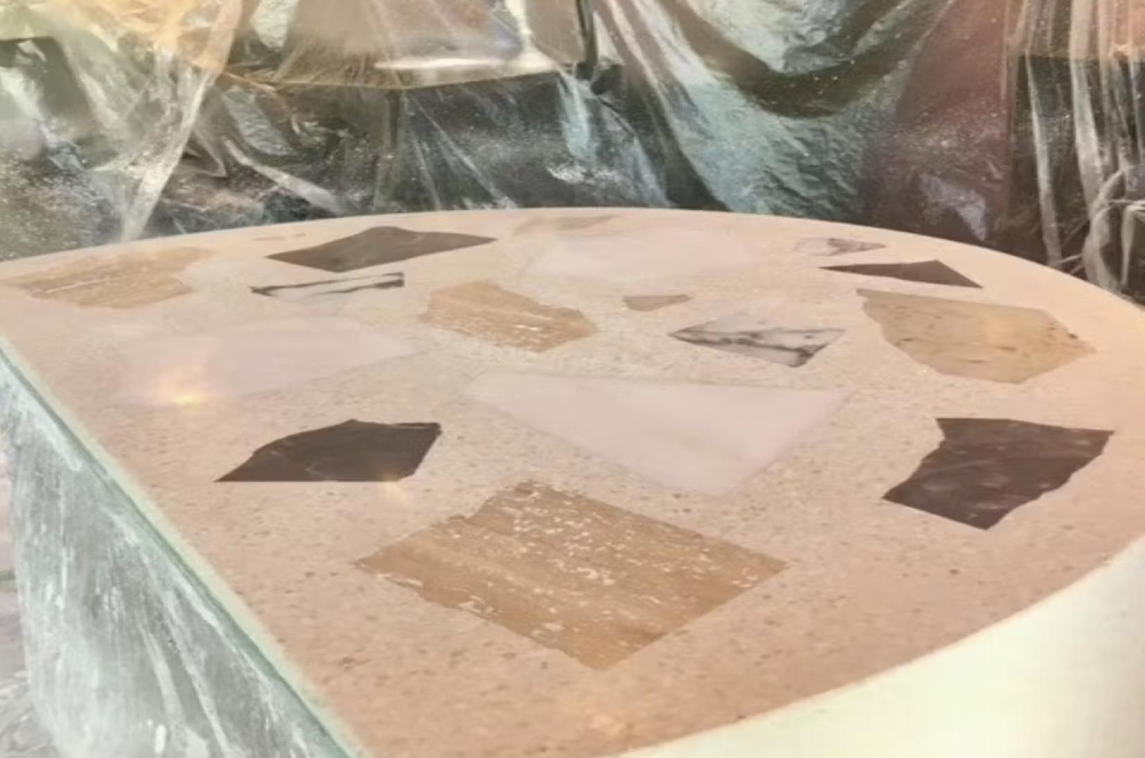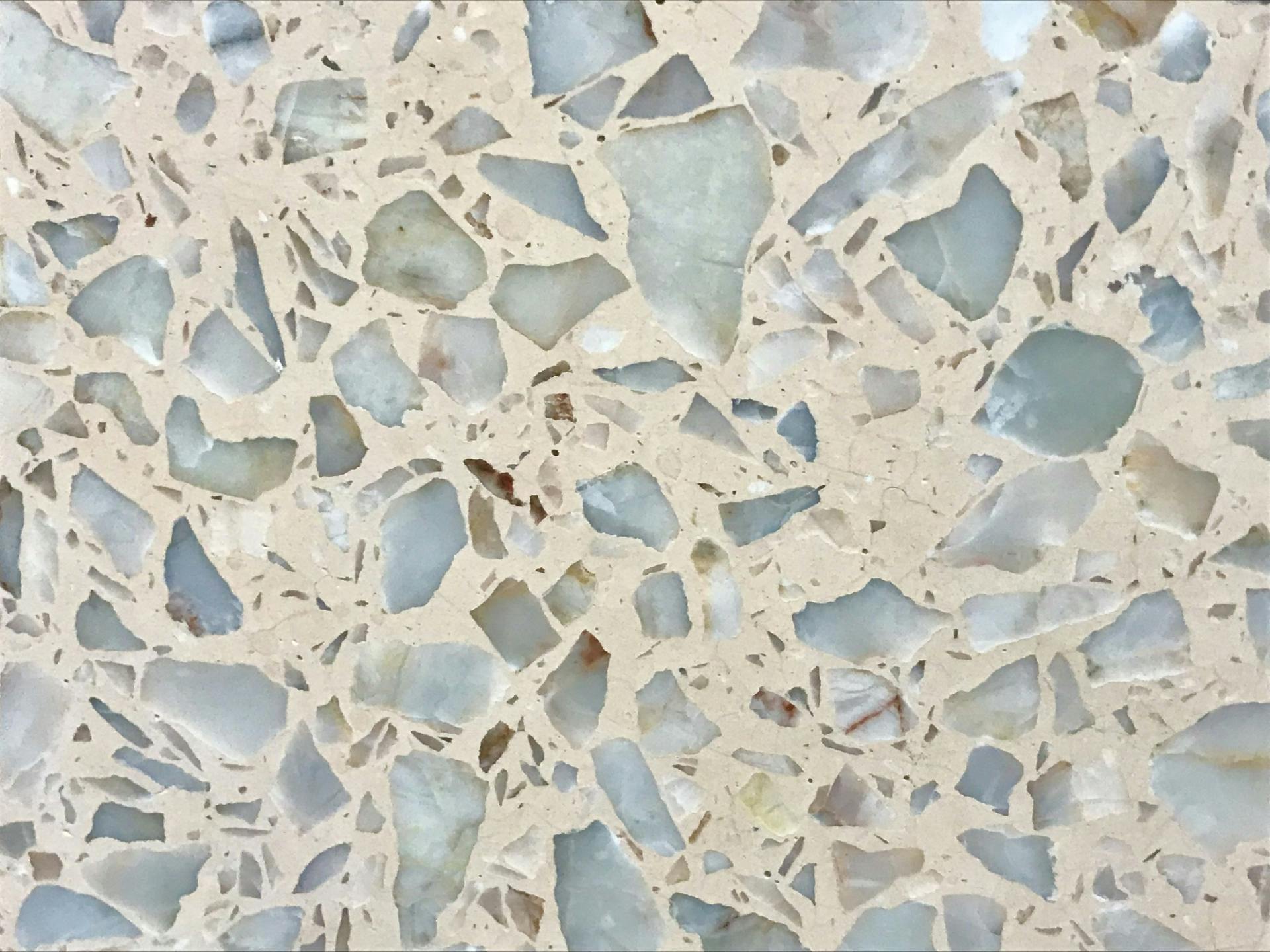 ビールストーンは、砕いた天然石や金属片、ガラスなどの骨材を独自の配合で組み合わせ、研磨して仕上げることで、まさに唯一無二の空間演出が可能になる素材。高級感がありつつ、使う人の想像力を最大限に引き出してくれる、いわばアートと建材の融合なんです。