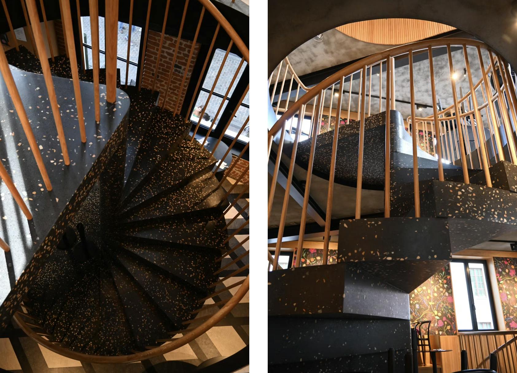 一方、テラゾータイルは既製のタイル製品で、フロアタイルなどとして使用される際には、ある程度パターンが固定されています。そのため、「もっと自由に、もっと個性的に」仕上げたい方にはビールストーンが最適です。ビールストーンの厚みは施工条件に応じて調整できるため、タイルでは対応が難しいカーブや螺旋階段、家具の表面にも施工できるという特長があります。