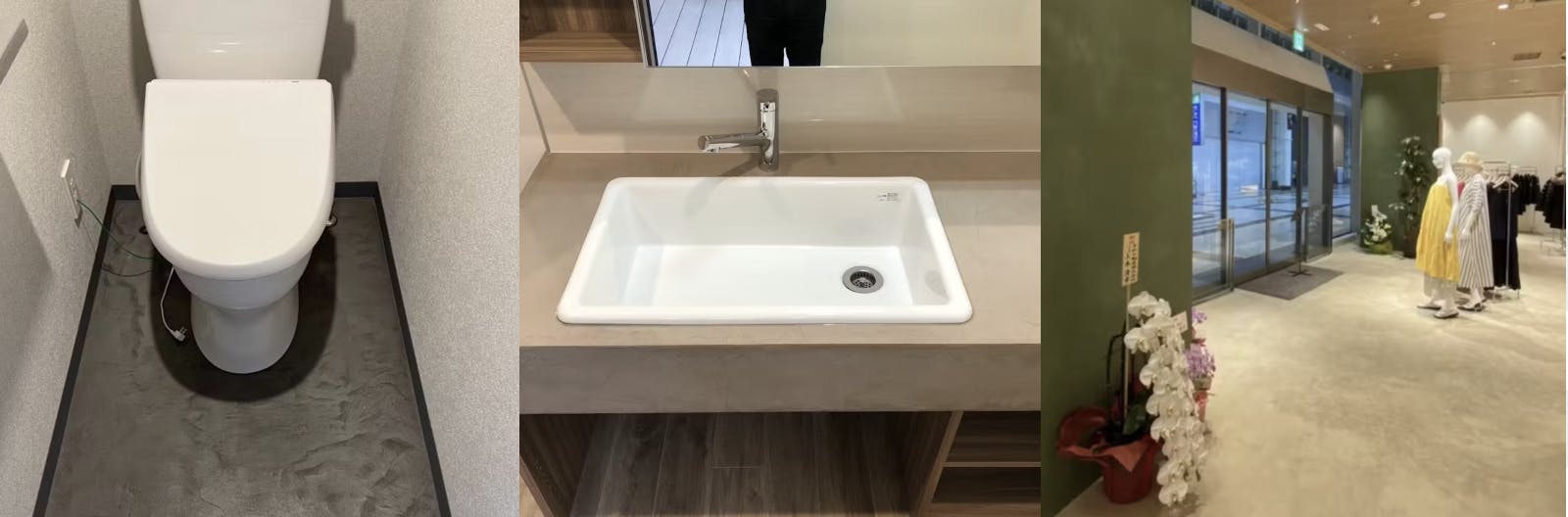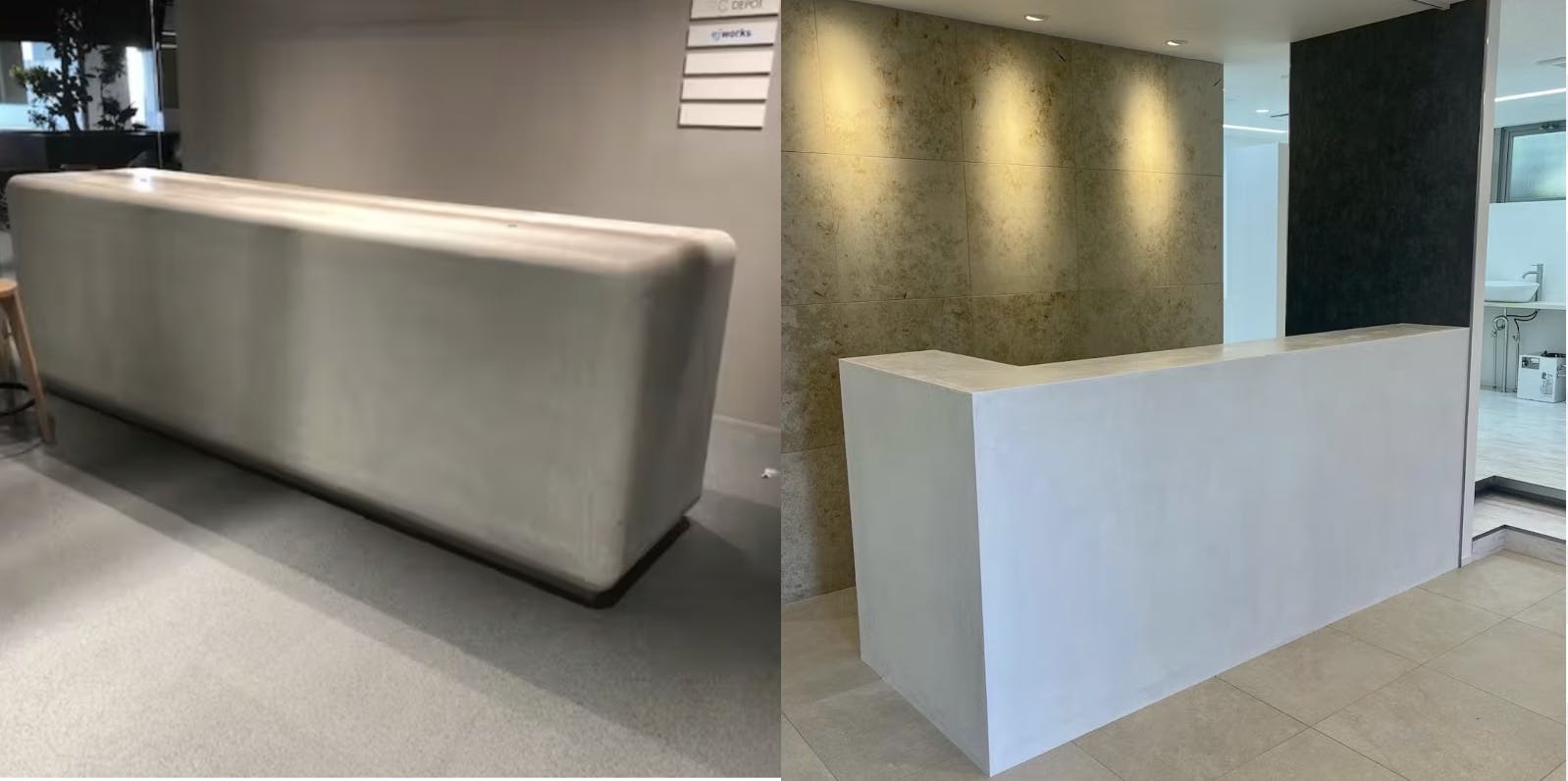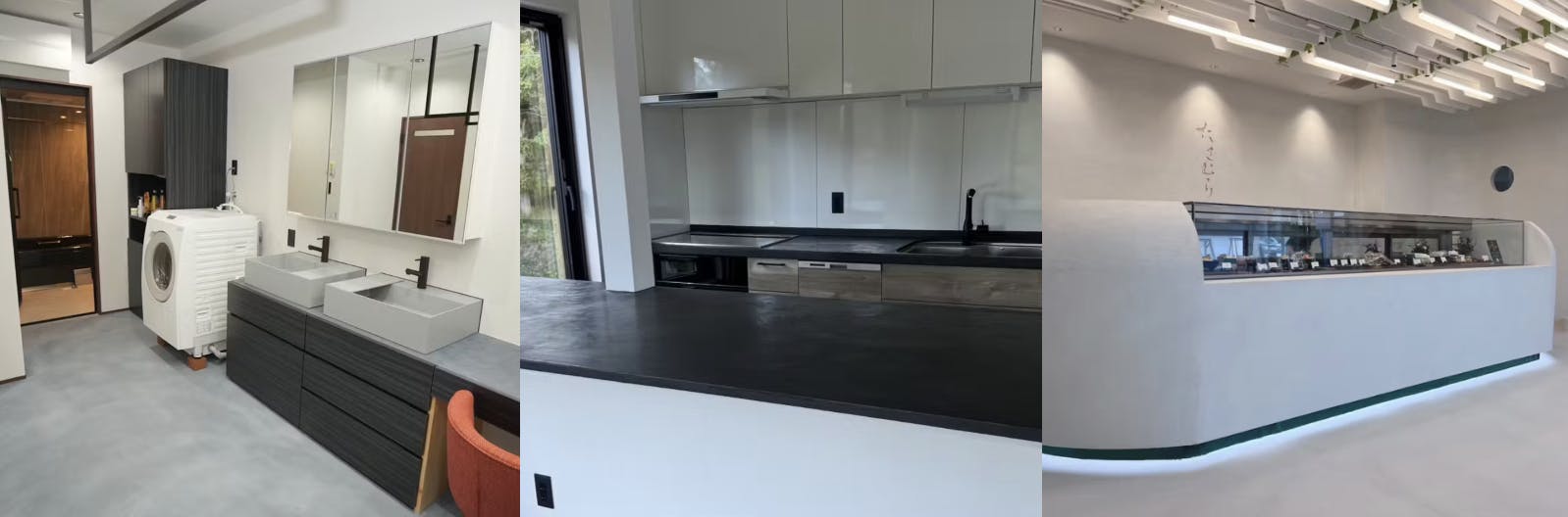 また、洗面台やキッチンカウンターに使用するケースも増えており、防水性があるため、水跳ねや湿気による劣化を気にせず安心して使うことができます。さらに、受付カウンターや商品陳列棚など、視覚的に印象を残したいポイントにも活用でき、デザインの自由度が非常に高いです。通常、こうした家具や什器は素材や仕上げの選択肢が限られがちですが、モールテックスであれば自分好みの色味や質感に仕上げることができるため、“自分らしい空間づくり”を実現する素材として、多くのデザイナーやオーナーから選ばれています。
