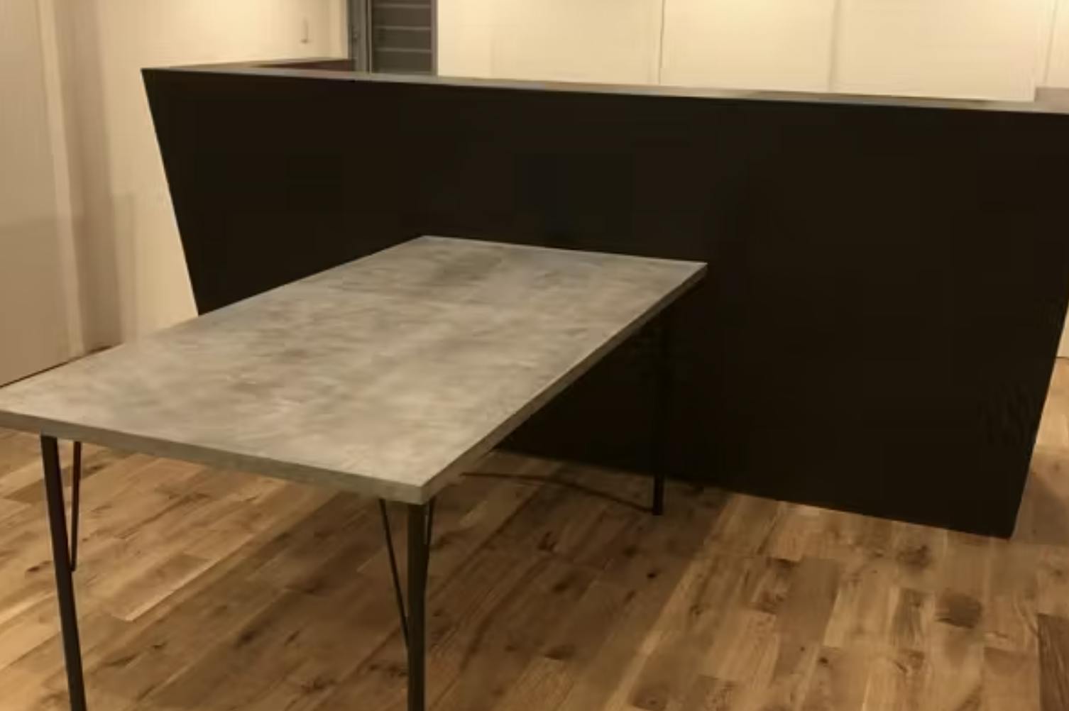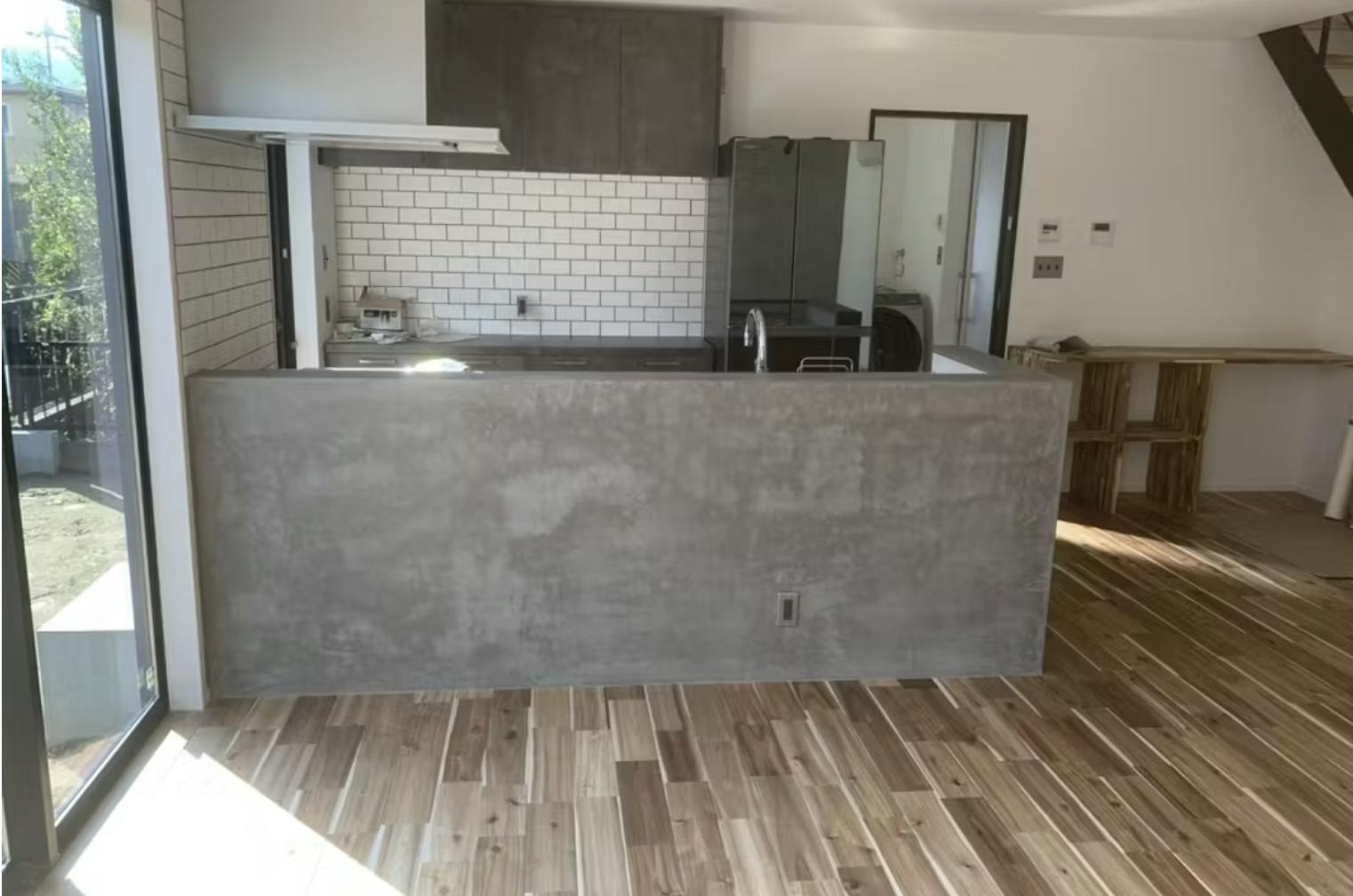 モールテックスは、壁だけでなく家具や什器にも塗れる柔軟性の高さが魅力です。たとえば、ダイニングテーブルの天板に使用すれば、まるで打ちっぱなしコンクリートのような存在感のあるデザインが完成します。無垢材やアイアンとの相性も抜群で、空間全体のインテリアと自然に馴染みます。