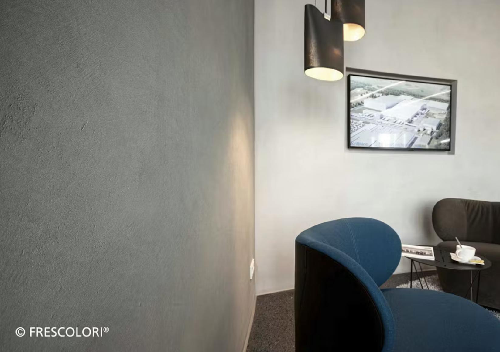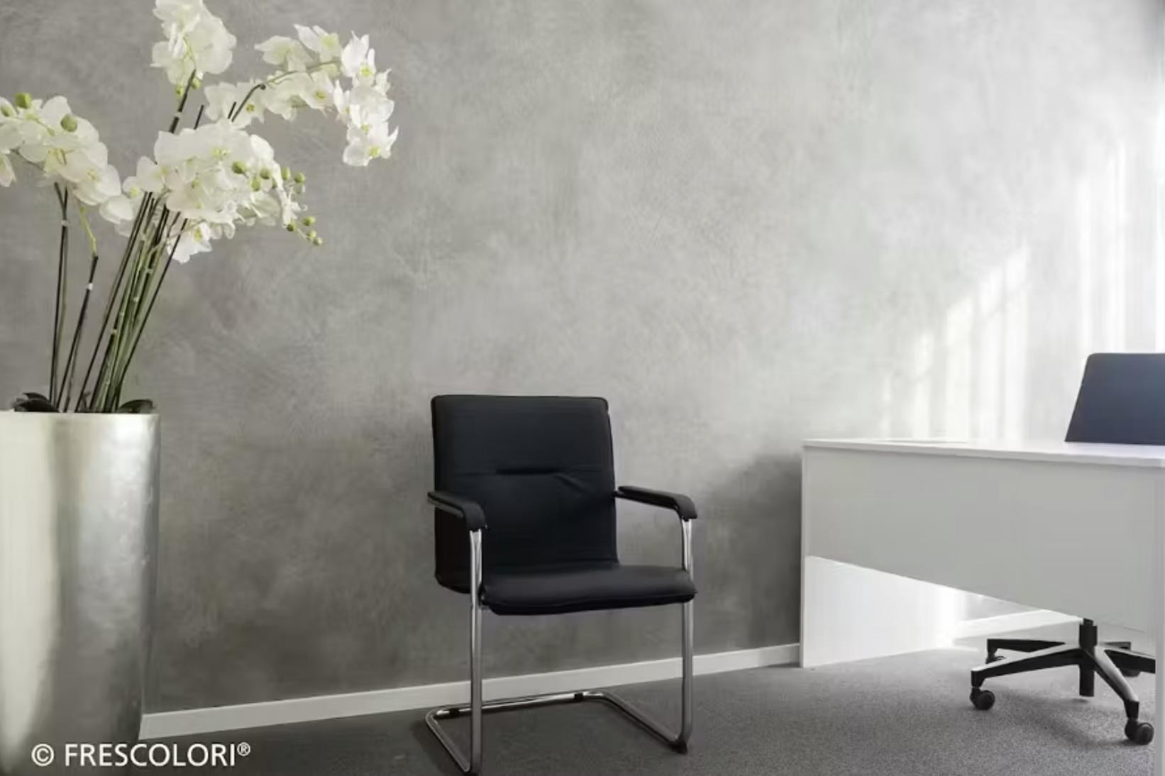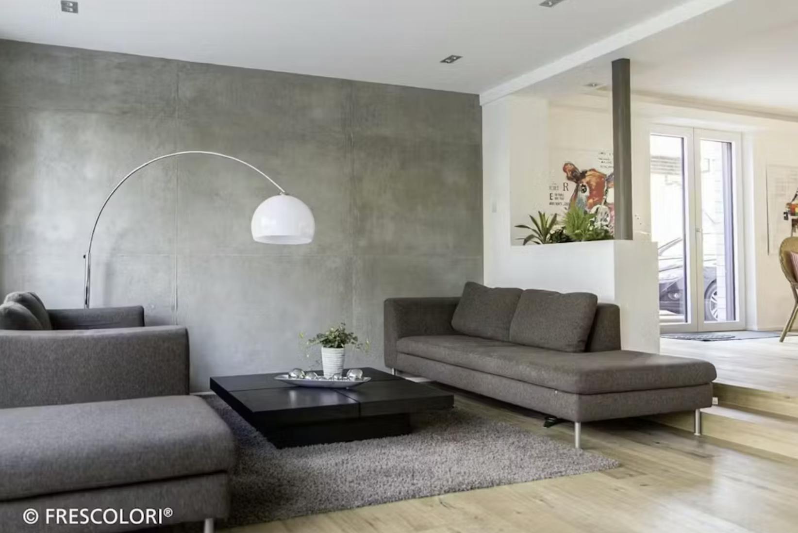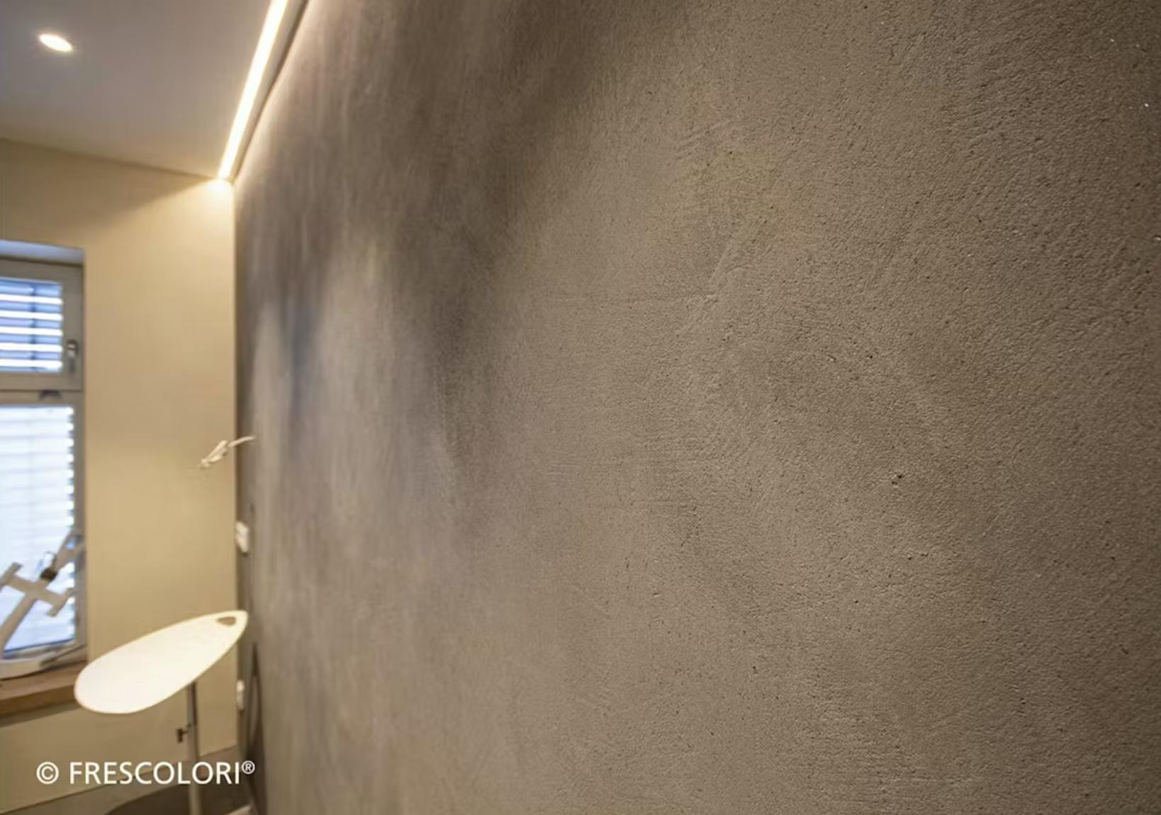 壁一面に塗られたフレスカラリが、まるで打ちっぱなしのコンクリート壁そのもののような雰囲気を演出しており、無機質でありながら洗練された空間に仕上がっています。