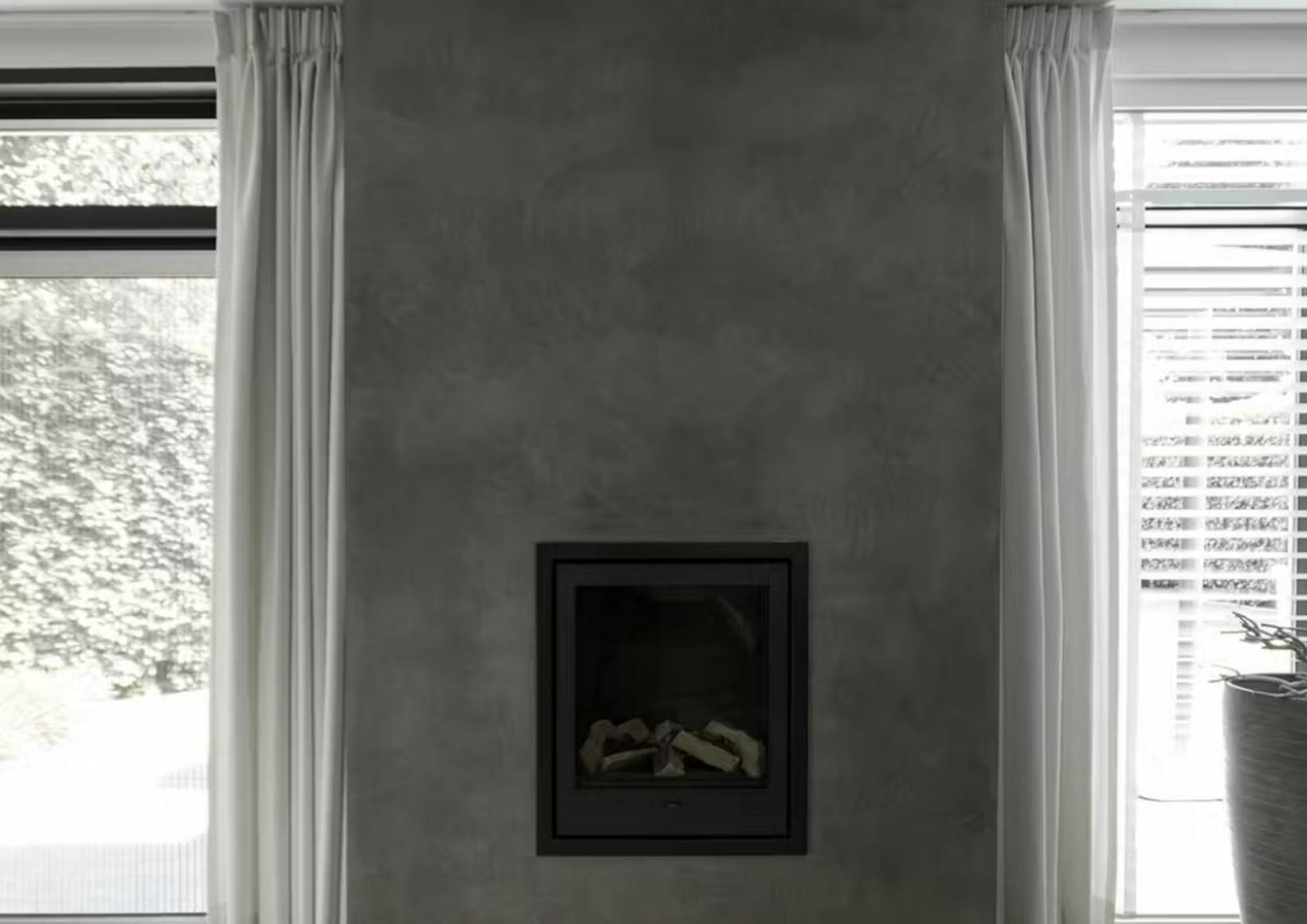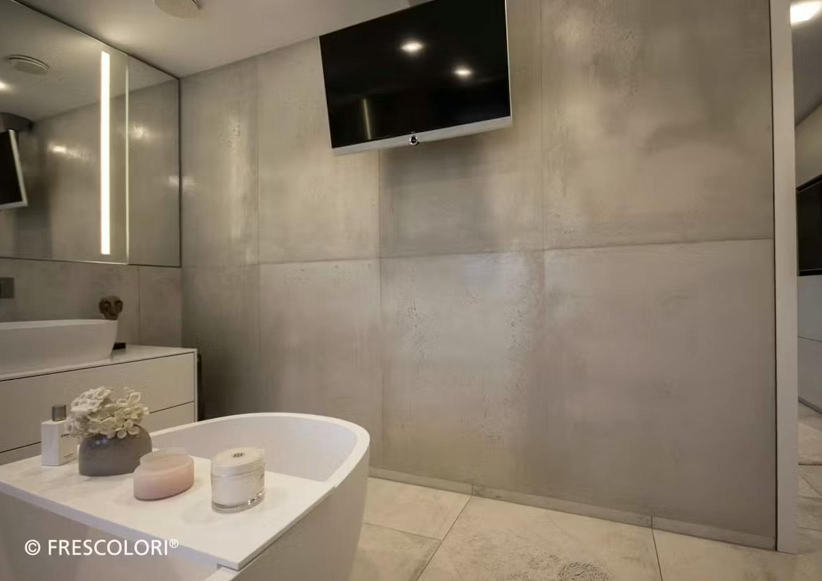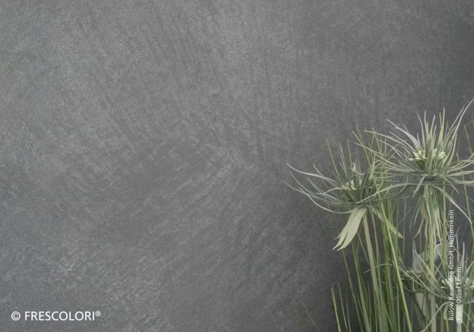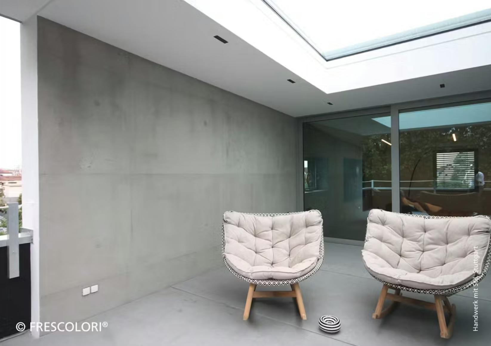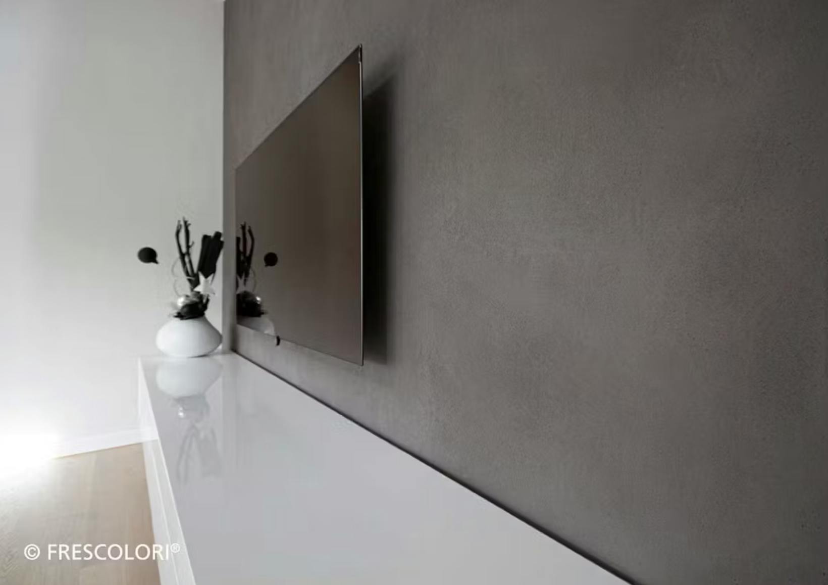 壁一面に塗られたフレスカラリが、まるで打ちっぱなしのコンクリート壁そのもののような雰囲気を演出しており、無機質でありながら洗練された空間に仕上がっています。