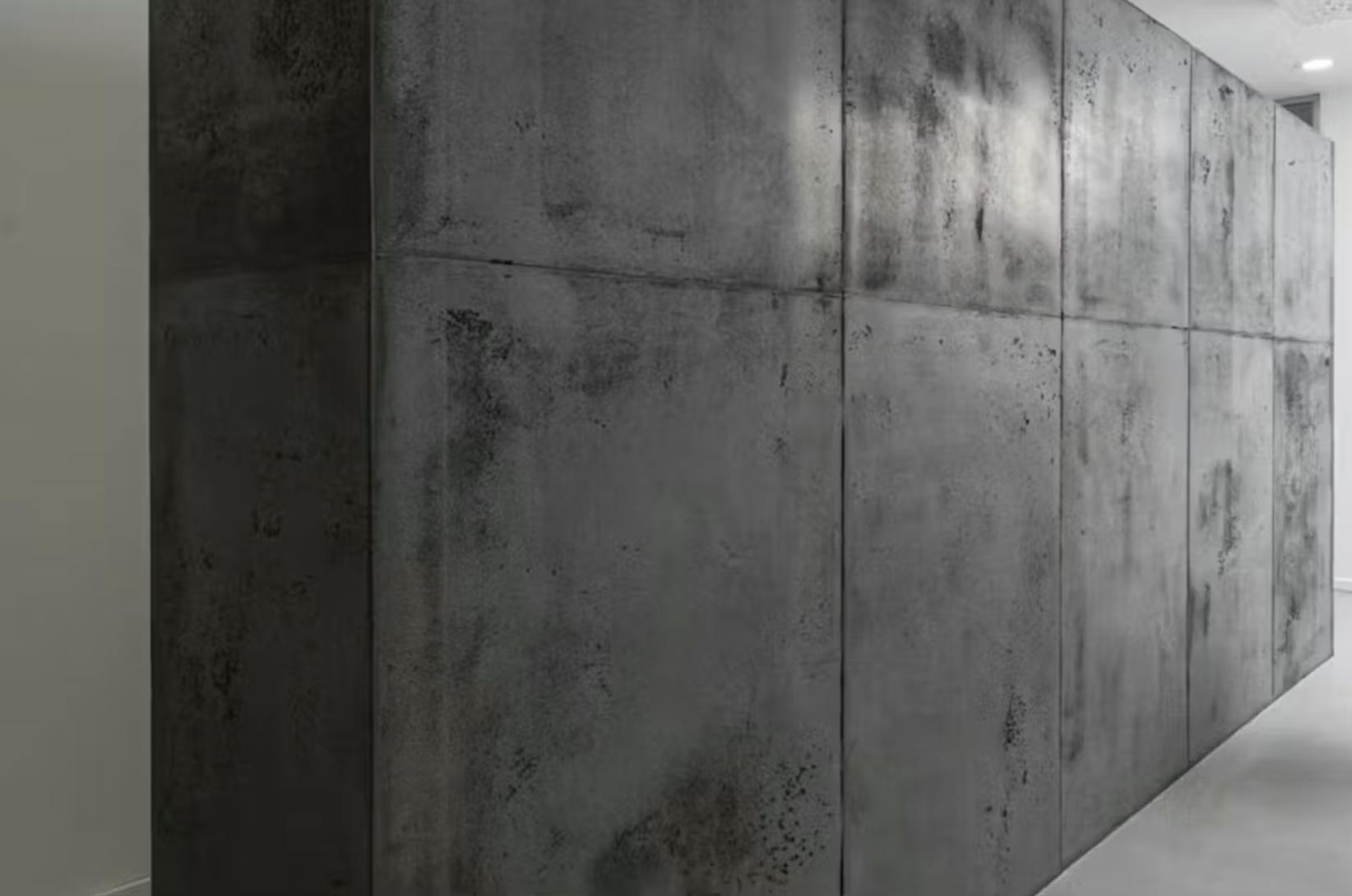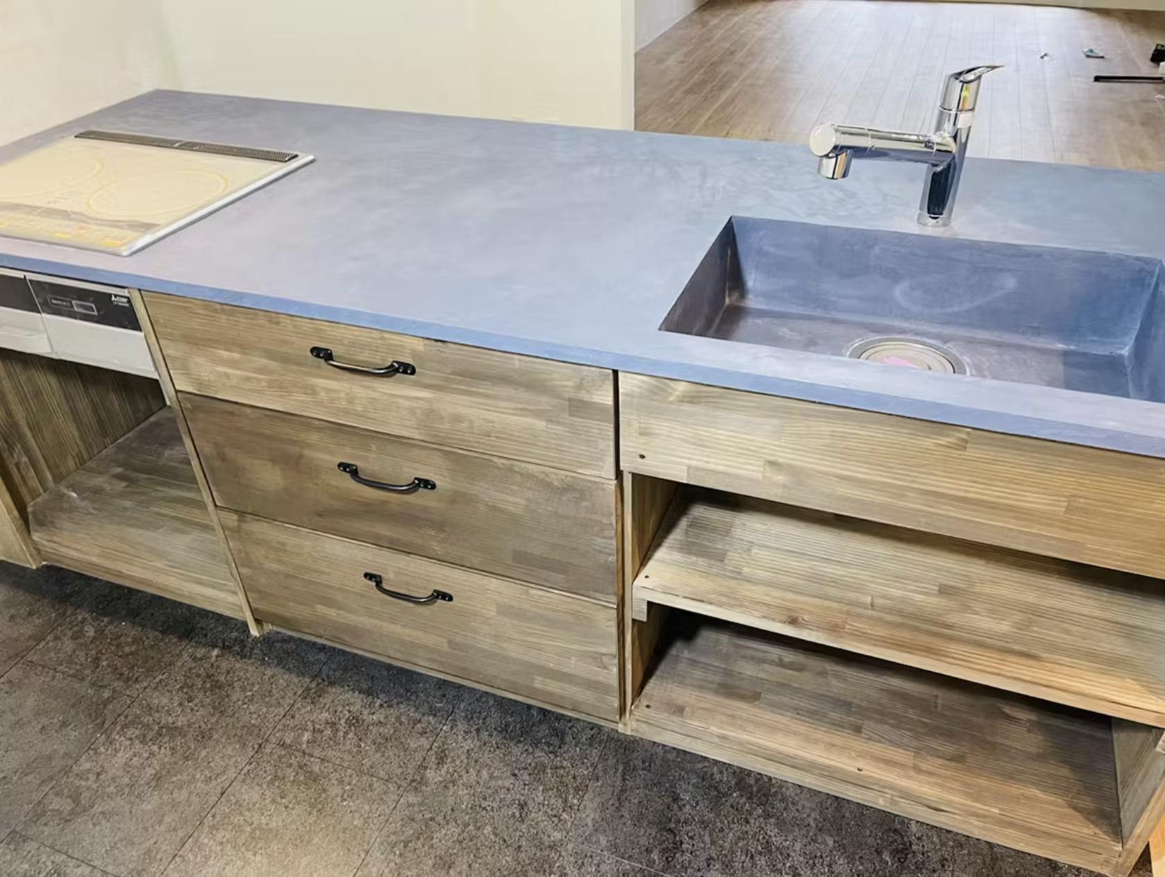 仕上がりは、一見すると冷たい印象のコンクリート風。しかし、手仕事による微妙な陰影があるため、光の当たり方によって見え方が変わるという“動きのある質感”が特長。無機質すぎず、どこか温かみすら感じる、絶妙なバランスを持った素材です。