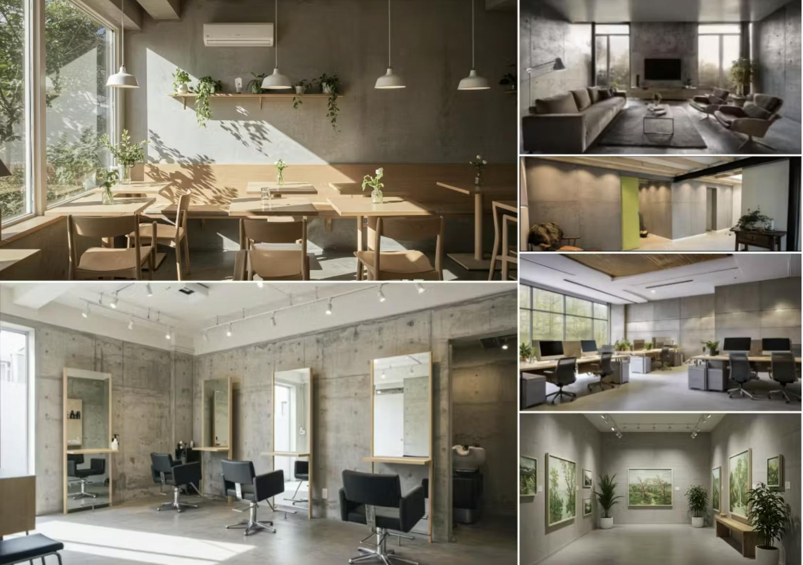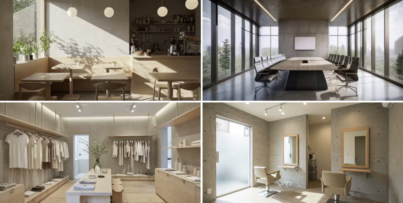 「内装用の左官材」と聞くと、住宅の壁だけに使えると思う方もいるかもしれません。しかし、フレスカラリの施工対応力はそれに留まりません。住宅はもちろん、カフェ・アパレルショップ・美容室・オフィスなど、さまざまな空間で活用されています。