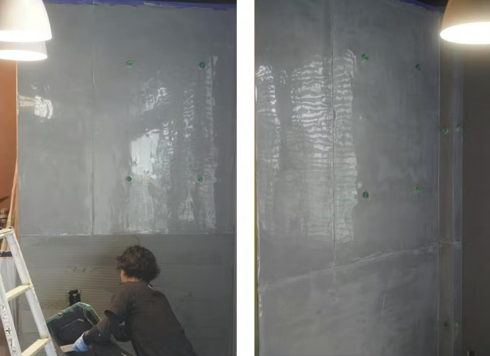 しかも、この“本物っぽさ”が機械的ではなく、手作業で生まれるムラや表情によって仕上がるため、見る角度や光の入り方によって微妙に印象が変わるのも魅力。店舗やリビングなど、「空間の顔」となる場所にぴったりの選択です。