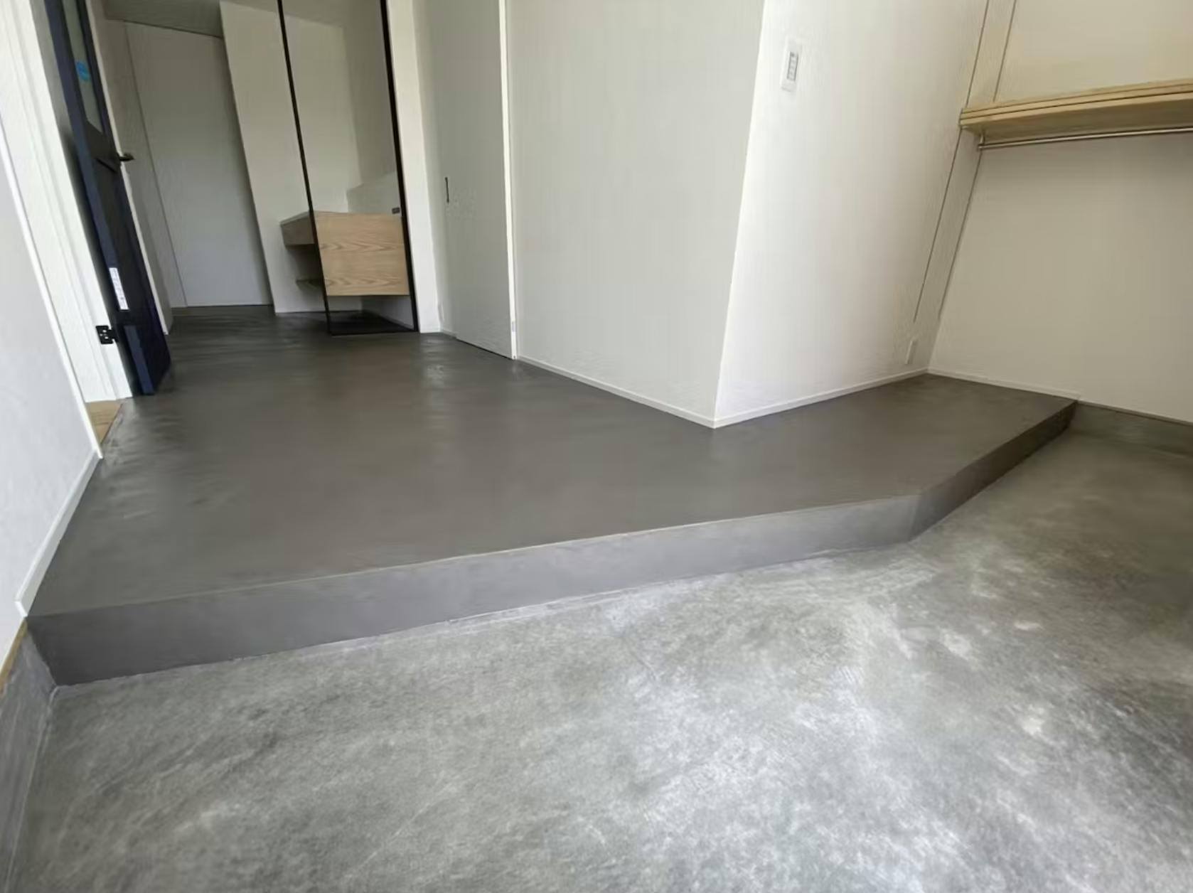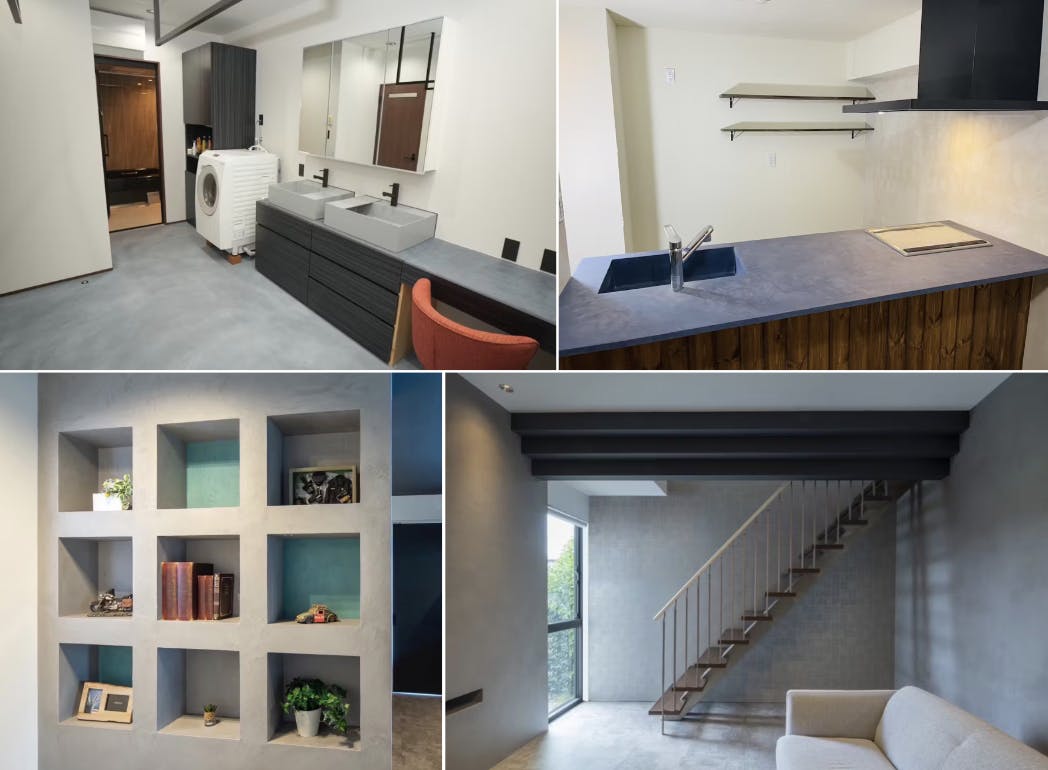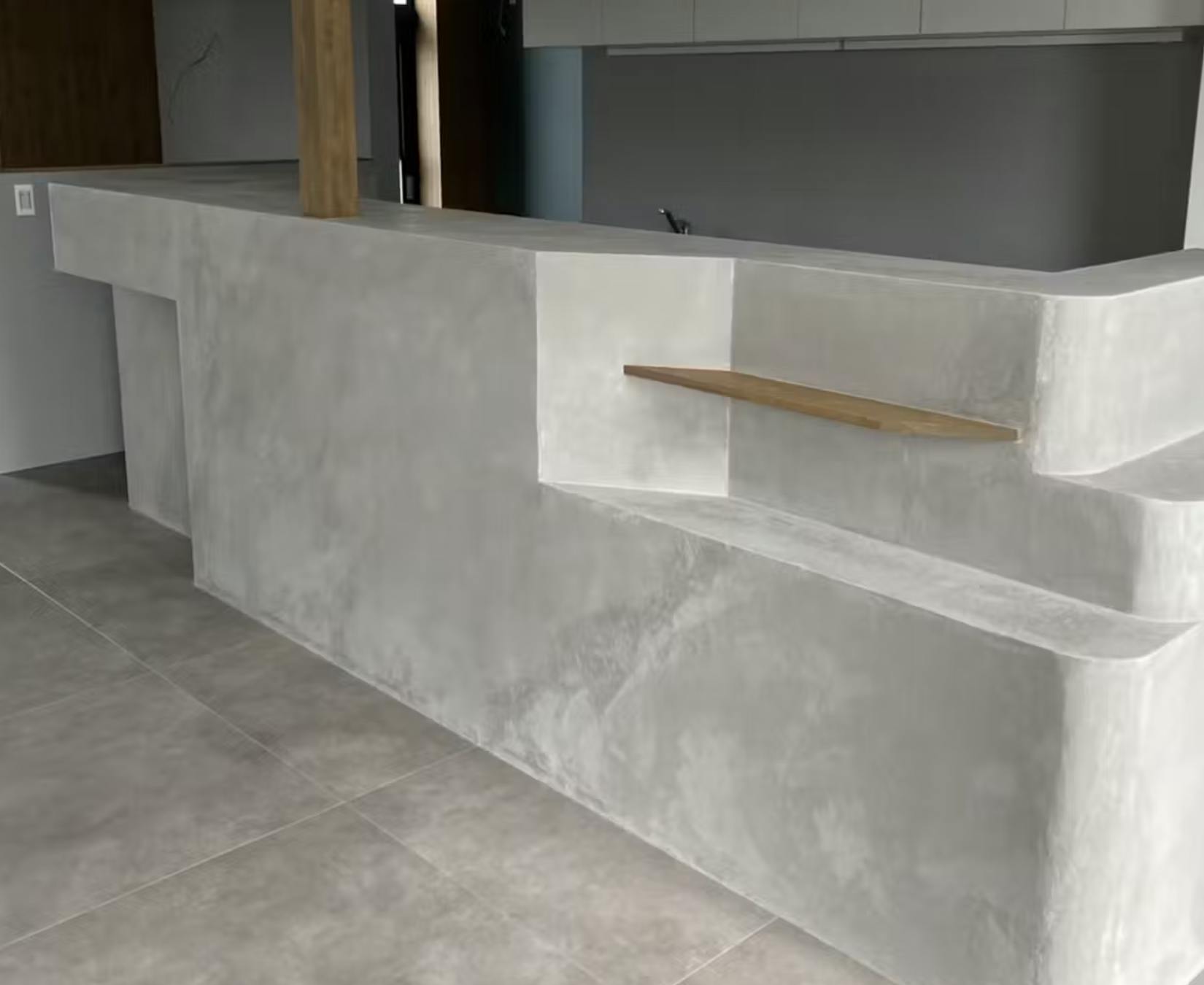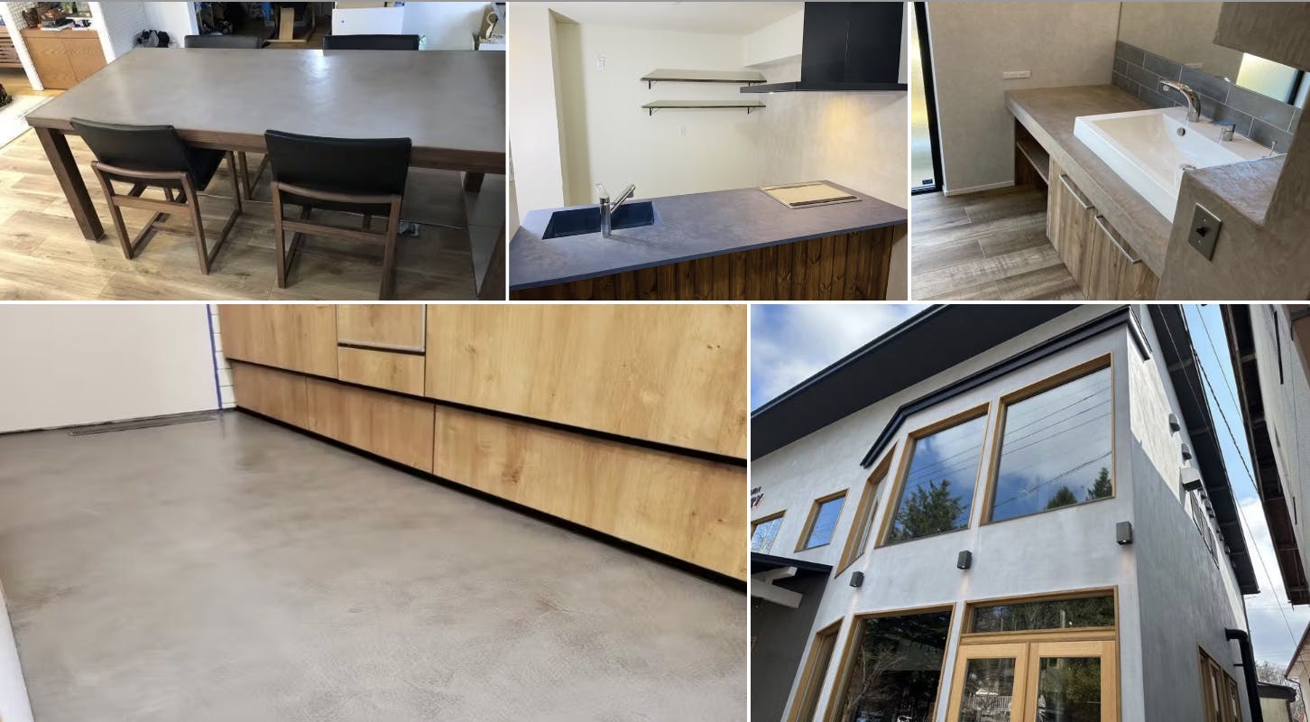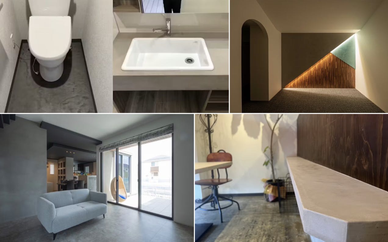 見た目はコンクリートのような無機質で洗練された質感ですが、内部には柔軟性があり、施工後もひび割れしにくいのが特徴。床・壁・家具など幅広い場所に使えることから、住宅だけでなく商業空間や店舗にも積極的に採用されている建材です。