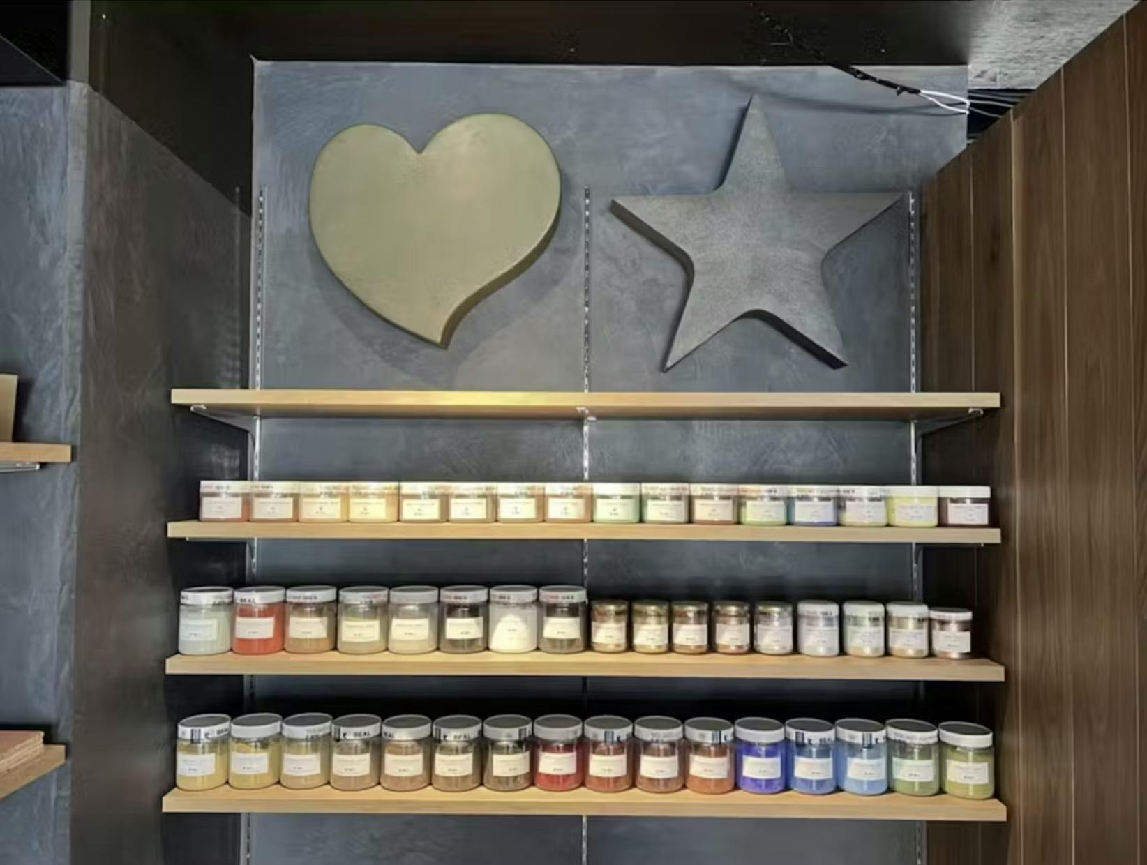 見た目の印象を左右する「色」の選択肢が多いのも、モールテックスが店舗内装に選ばれる理由のひとつです。サカンアートで取り扱っているモールテックスには標準色だけで64色が用意されており、さらに細かく調色することも可能です。