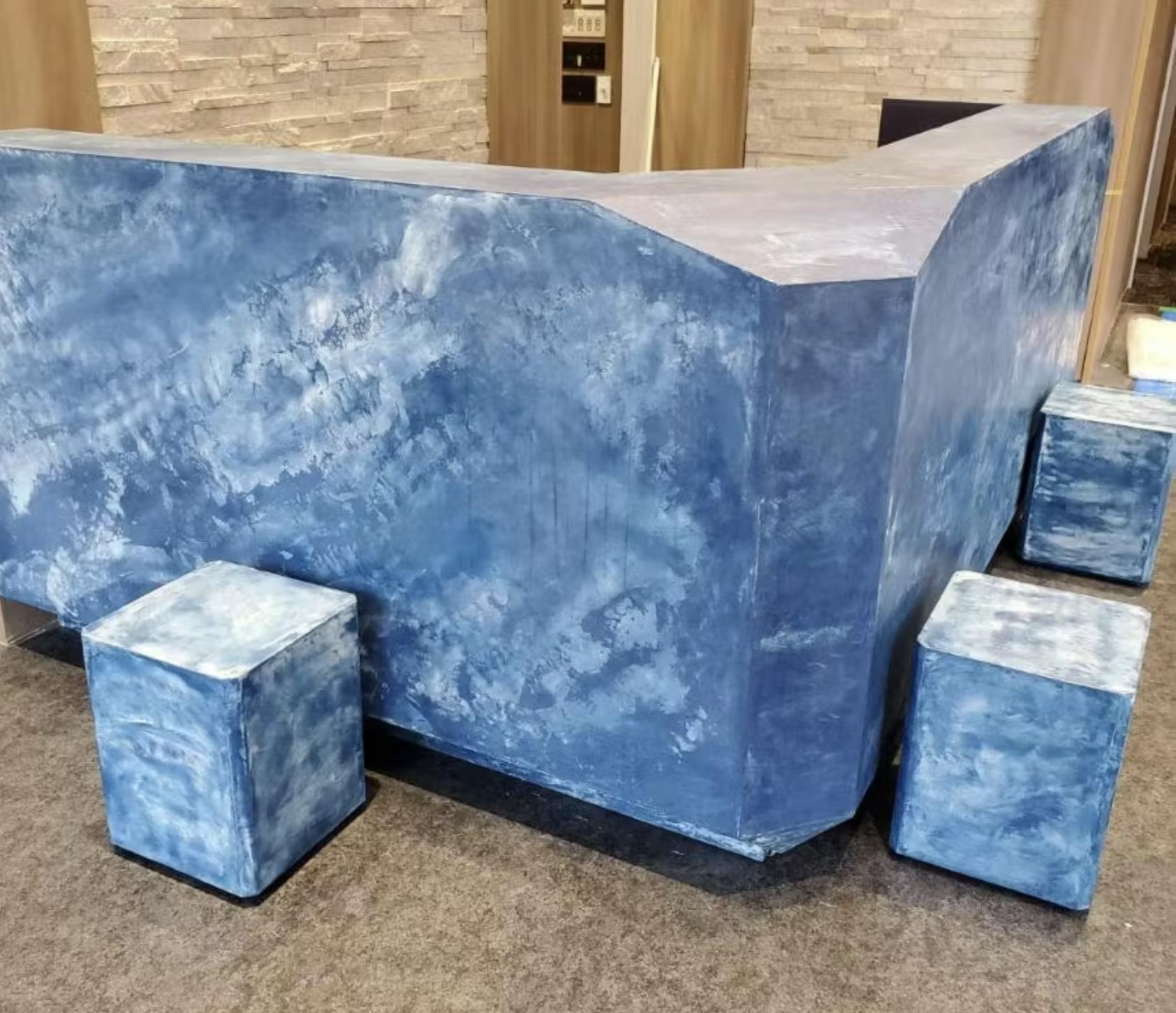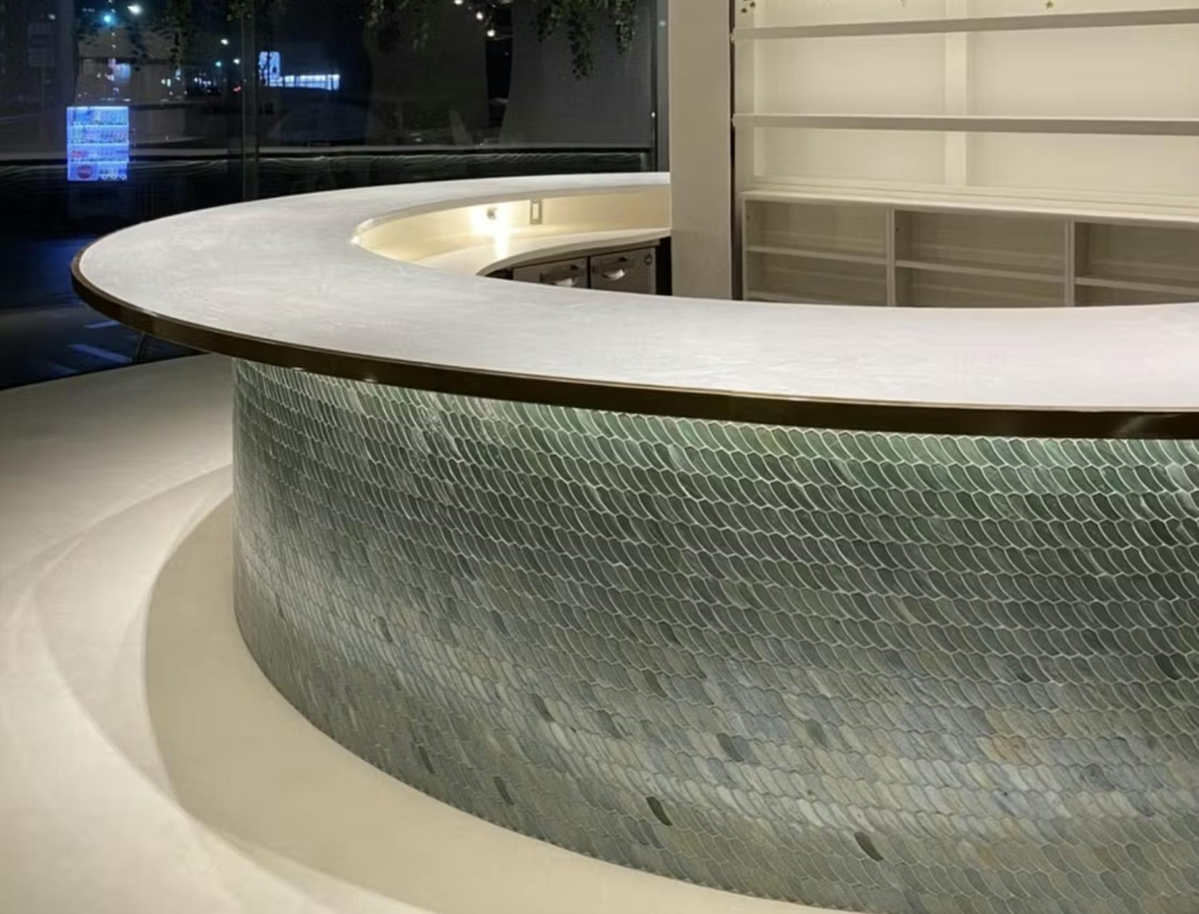 また、従来のモルタルやタイルでは難しかった「曲面」や「細かな部材」への施工もできるため、什器や造作家具にも違和感なくなじみます。