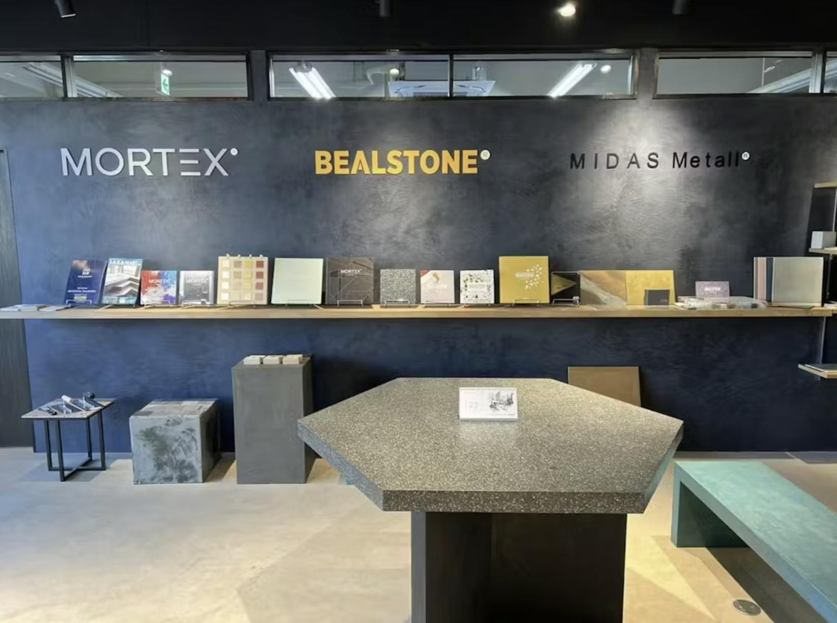 カラーはBM68というモルタル色で、コンクリート風の無機質さを生かしながらも、照明や商品のレイアウトと調和し、あたたかみのある空間に仕上がっているのが特徴です。