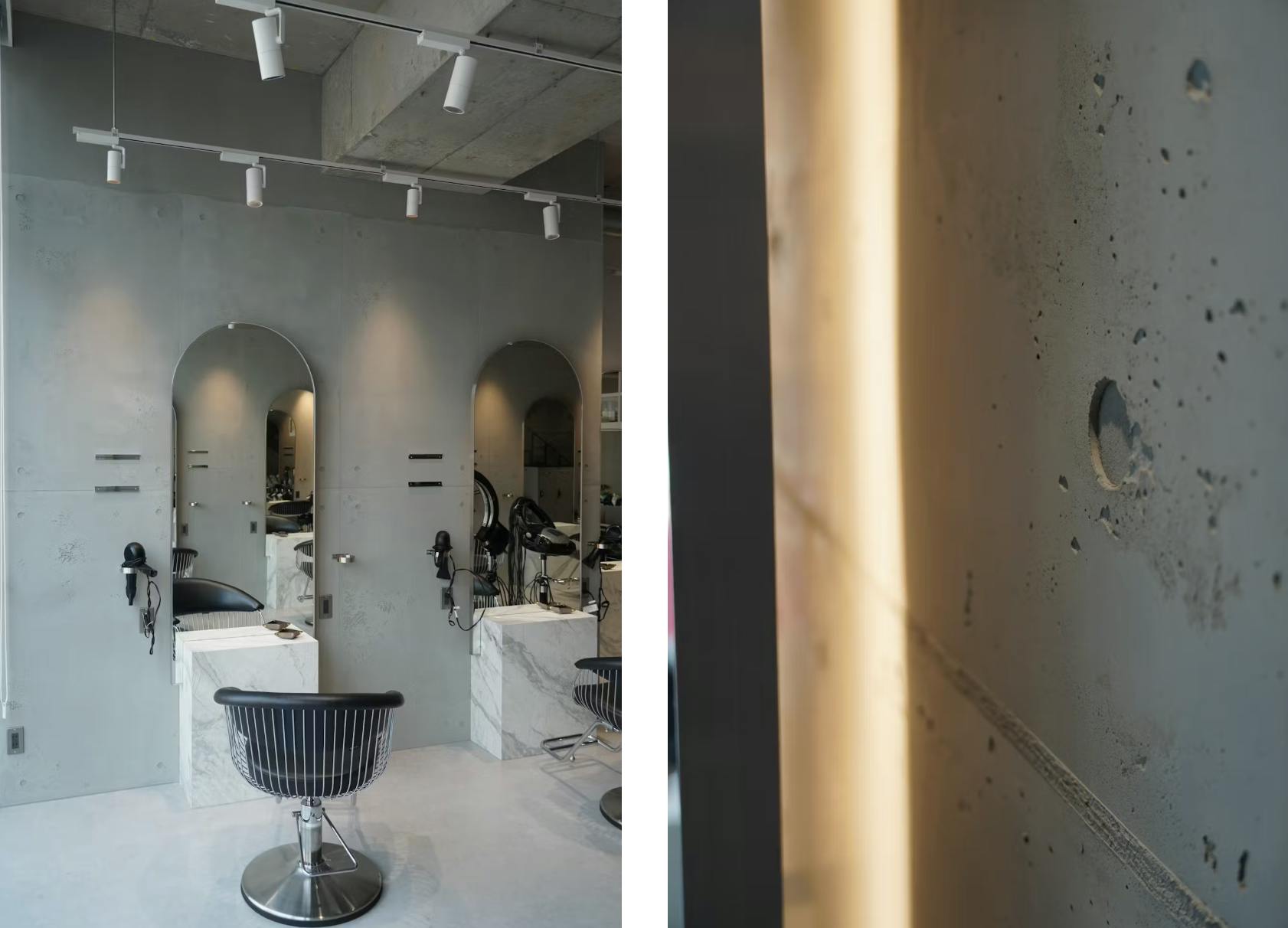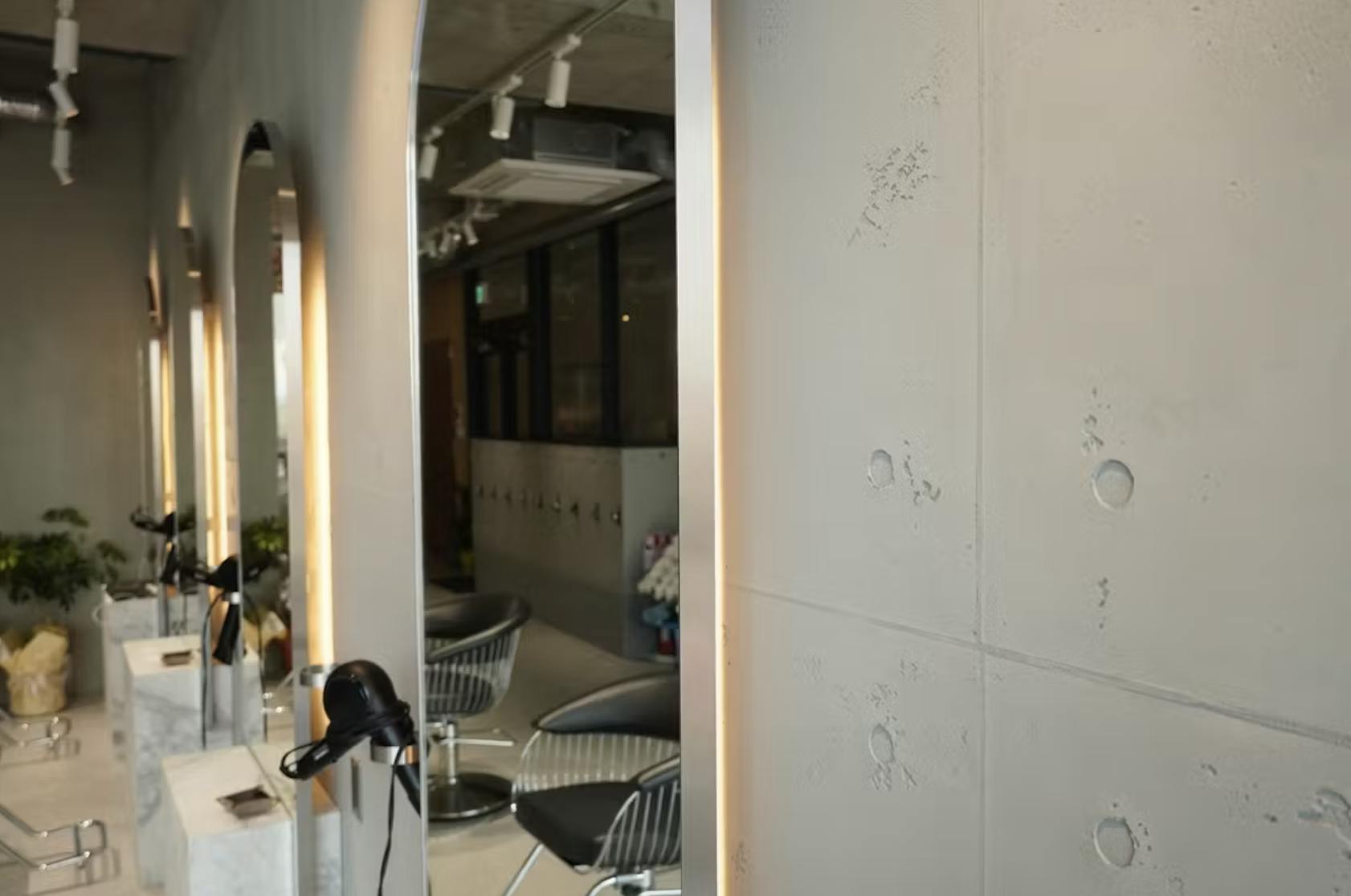 名古屋市にある美容室の内装にフレスコトンが採用されたこちらの施工事例では、無機質でスタイリッシュな空間演出が際立ちます。