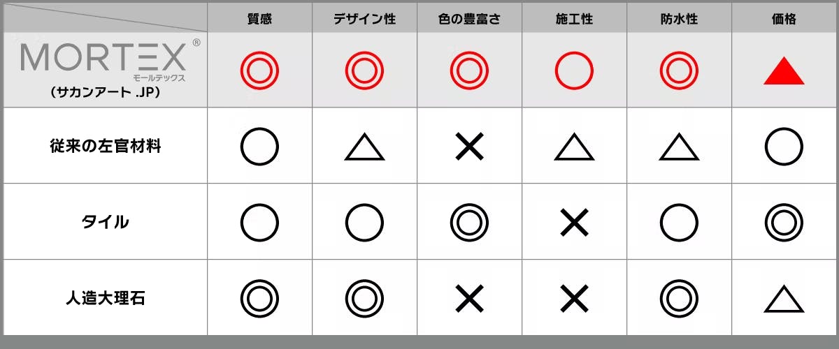 左官材料モールテックスとその他の材料との比較