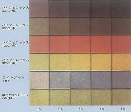 下の写真は普通ポルトランドセメントを用い、各色の顔料を1~9%まで添加量(対セメント重量)を変えて着色したブロックを並べて、色の濃淡の違いを示した見本です。